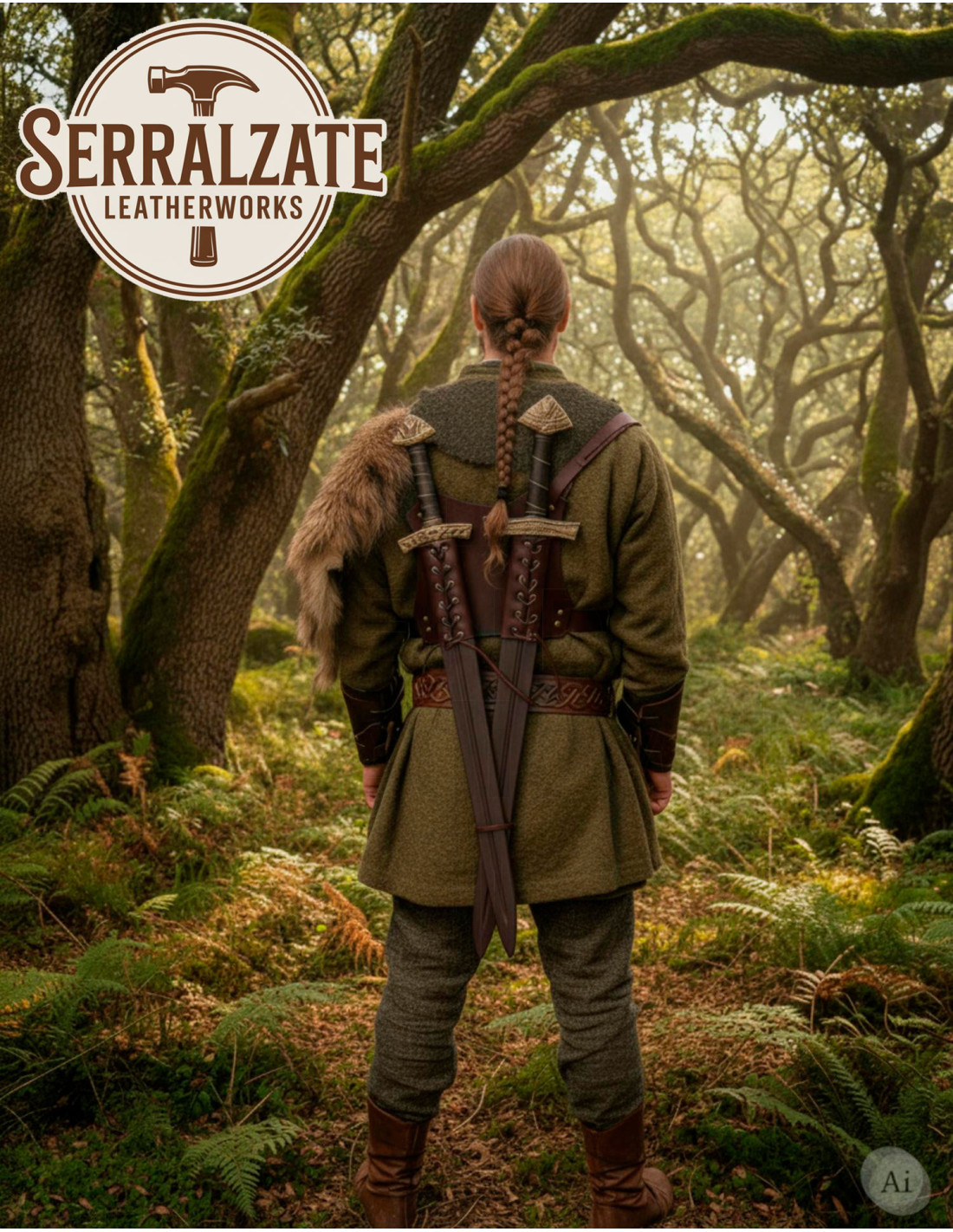 Das selbstjustierende System und die verstellbaren Gürtel an Brust und Schultern sorgen für eine individuelle Passform, die Scheuerstellen und Schwankungen vermeidet, die Haltung fördert und einen stabilen Transport bei langen Einsätzen ermöglicht. Das braune Finish verleiht Diskretion und Eleganz – perfekt für Kämpfe, Trainingseinheiten oder Reenactments – während die handwerkliche Verarbeitung Langlebigkeit und eine Ästhetik garantiert, die mit der Nutzung schöner wird.