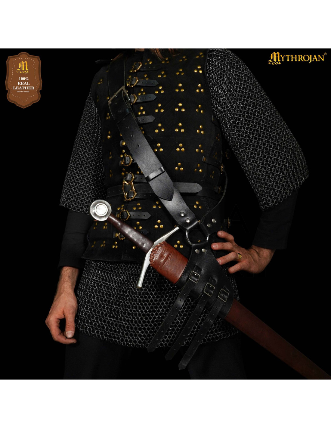 Die rechteckigen Metallschnallen und die verstärkten Nieten sorgen für einen festen und langlebigen Verschluss, damit das Schwert während Umzüge, inszenierten Kämpfen oder Darbietungen sicher bleibt. Die Oberflächenbehandlungen und Verstärkungen sind darauf ausgelegt, intensiven Gebrauch zu widerstehen, ohne die historische Erscheinung zu verlieren.