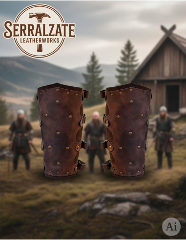 Diese handgefertigten Beinschienen in Spanien kombinieren hochwertiges Rindsleder und Wildleder und bieten ein robustes Gefühl sowie zuverlässigen Schutz, ohne auf Komfort zu verzichten. Das Leder behält seine Form bei Gebrauch, hebt deine Präsenz hervor und verleiht das authentische Aussehen, das du bei einem mittelalterlich inspirierten Stück suchst.