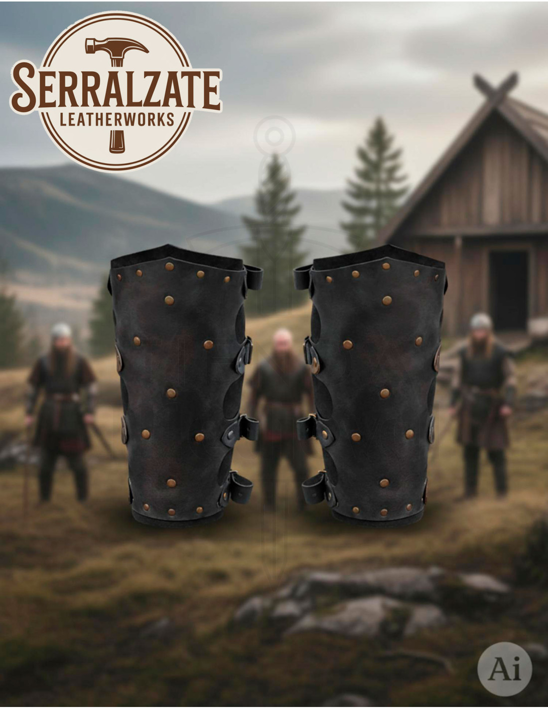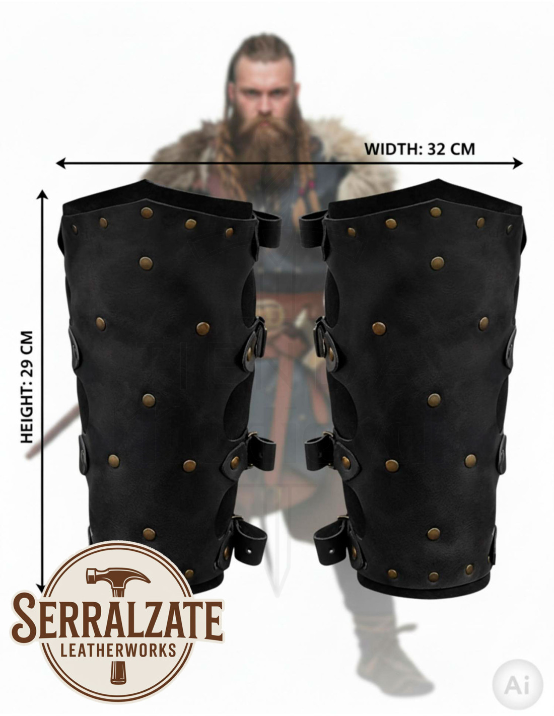Diese handgefertigten Greaves in Spanien kombinieren hochwertiges Rindsleder und Wildleder und bieten ein robustes Gefühl sowie zuverlässigen Schutz, ohne auf Komfort zu verzichten. Das Leder behält seine Form bei Gebrauch, hebt deine Präsenz hervor und verleiht das authentische Aussehen, das du bei einem mittelalterlich inspirierten Stück suchst.