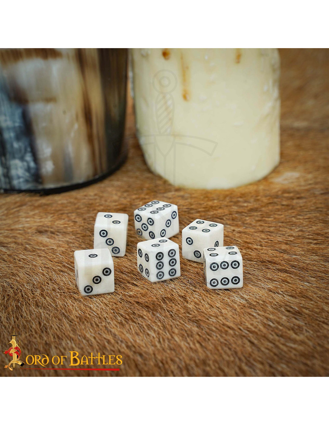 Ihr visuelles Design, mit konzentrischen Kreisen auf der Oberfläche und dem Logo von 'Lord of Battles' am unteren Rand, spiegelt die handwerkliche Qualität und den charakteristischen Stil wider, die jede Würfelwurf zu einem authentischen und spannenden Erlebnis machen.