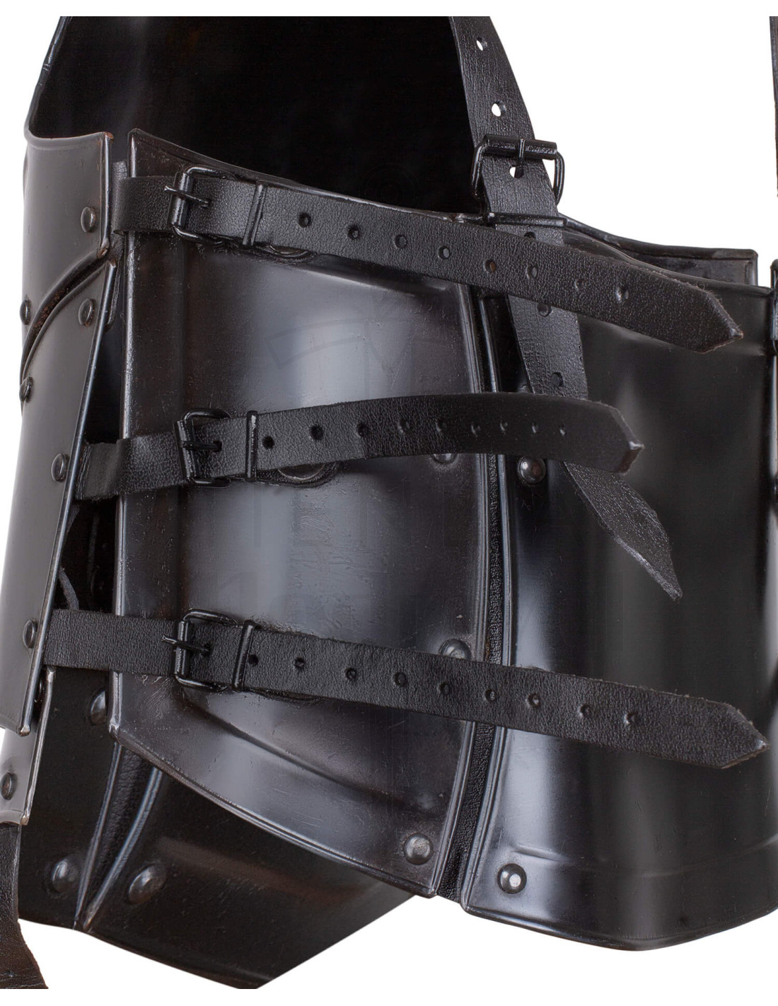Bist du bereit, deinen Krieger-Look mit einem Hauch von Eleganz und maximaler Funktionalität zu verstärken? Diese mittelalterliche Rüstung aus schwarzem Stahl, inspiriert vom Universum der heroischen Fantasie, verbindet anspruchsvolles Design mit einer Passform, die sich perfekt an dich anpasst. Entwickelt mit Blick auf Komfort und Beweglichkeit, passen sich die Strukturen aus Front- und Rückteilen dank seitlicher Schnallen individuell an, sodass du sie nach deiner Figur personalisieren kannst.