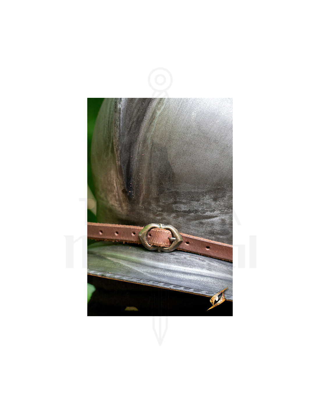 Der Ledergürtel aus hochwertigem pflanzlichem Leder sorgt für eine sichere und bequeme Passform, mit einem System aus Metallreißverschlüssen, das das An- und Ablegen des Helms erleichtert. Die Struktur des Stücks, inspiriert von den Kavalleriehelmen des 16. Jahrhunderts, bietet effizienten Schutz im oberen Bereich, mit Erweiterungen an den Wangen und einer Platte, die den Nacken schützt – so umhüllt Sie der Helm sicher und authentisch im Stil.