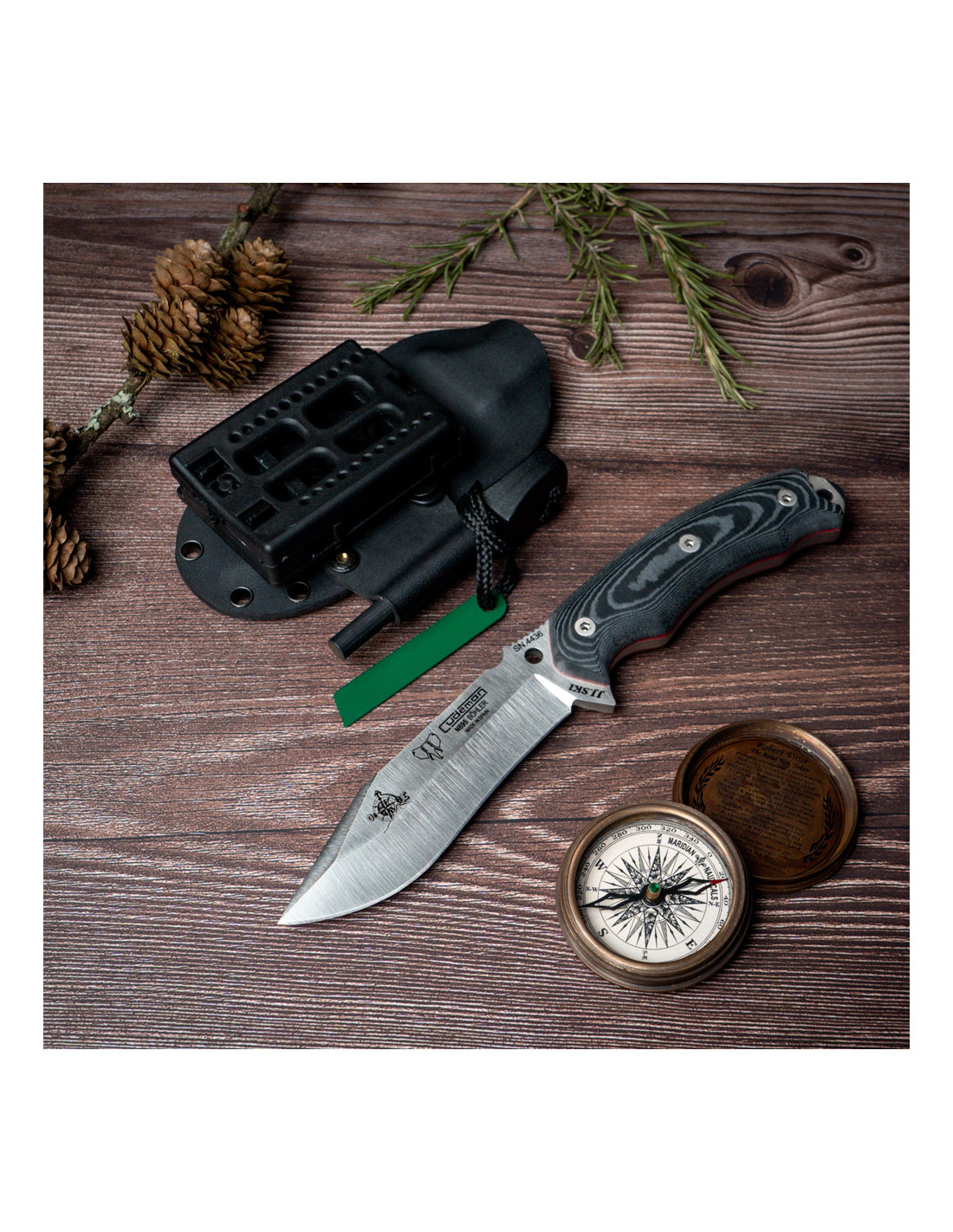 Suchen Sie ein hochwertiges und widerstandsfähiges Messer für Ihre Outdoor-Abenteuer?Das Cudeman Hausmesser ist die perfekte Wahl für Sie. Mit einer Klinge aus Böhler N-695-Stahl und einem schwarzen Micarta-Griff mit rotem Abstandshalter ist dieses Messer robust und langlebig.