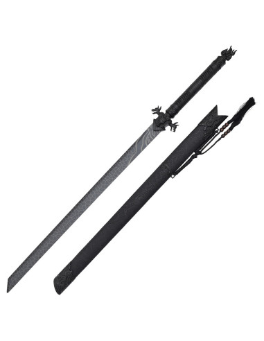 Das Schwert wird begleitet von einer schwarzen Holzscheide, verziert mit Reliefs, die das Drachenthema fortsetzen, und mit einer Holzperlenkordel ausgestattet, die das Aufhängen oder Festhalten erleichtert. Die Scheide schützt das Stück und macht es zugleich zu einem vollständigen Ausstellungsobjekt.