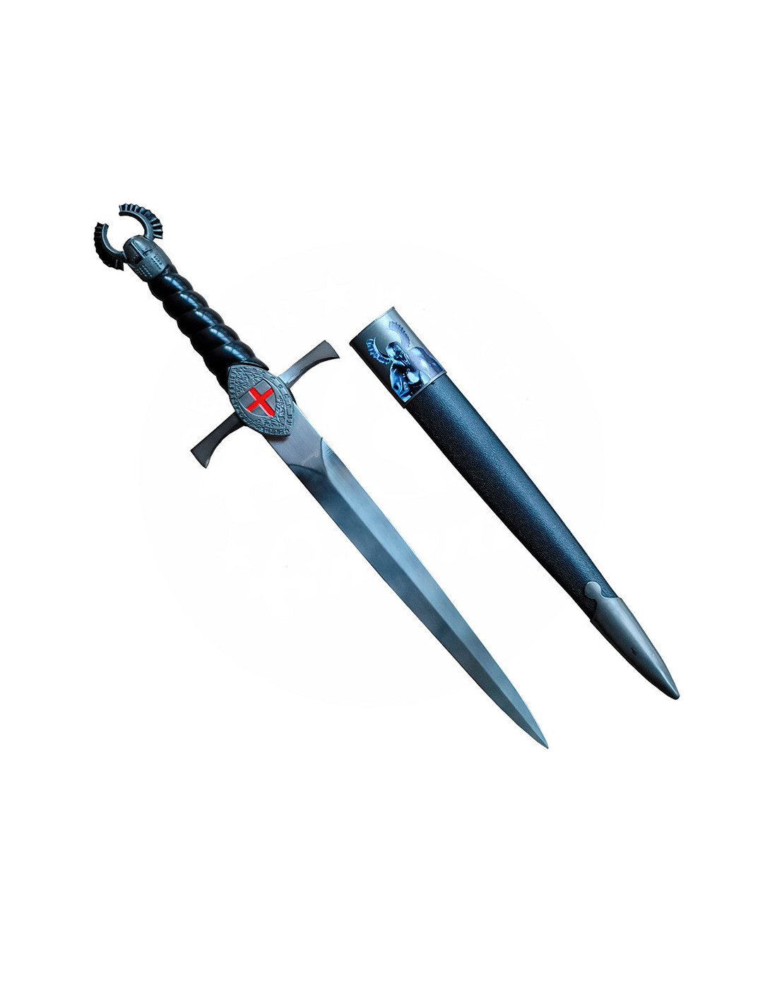 Dolch Templer Meister-Modell. Auf dem Knauf enthält es ein nickelfarbenes Gesicht. Inklusive schwarzer Scheide mit nickelfarbenen Details. Die Gesamtlänge des Dolches beträgt 34 cm.