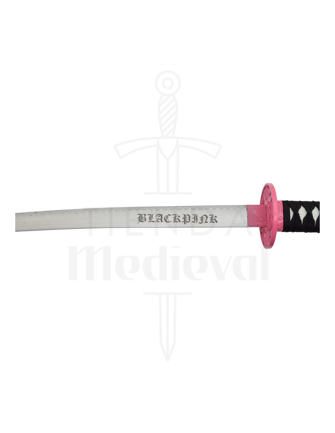 Der rosafarbene Metallknauf mit floralen Motiven, zusammen mit der passenden Scheide, spiegelt einen zarten und auffälligen Stil wider, inspiriert von der Persönlichkeit und Eleganz von Kanao Tsuyuri. Das vollständige Set, mit einer Gesamtlänge von 950 mm (1020 mm mit Scheide), ist leicht und einfach zu handhaben, mit einem Gewicht, das den dekorativen oder Cosplay-Einsatz erleichtert. Die Inschrift 'BLACKPINK' auf der Klinge verleiht einen modernen Touch und verbindet die Welt des Anime mit zeitgenössischen Details.