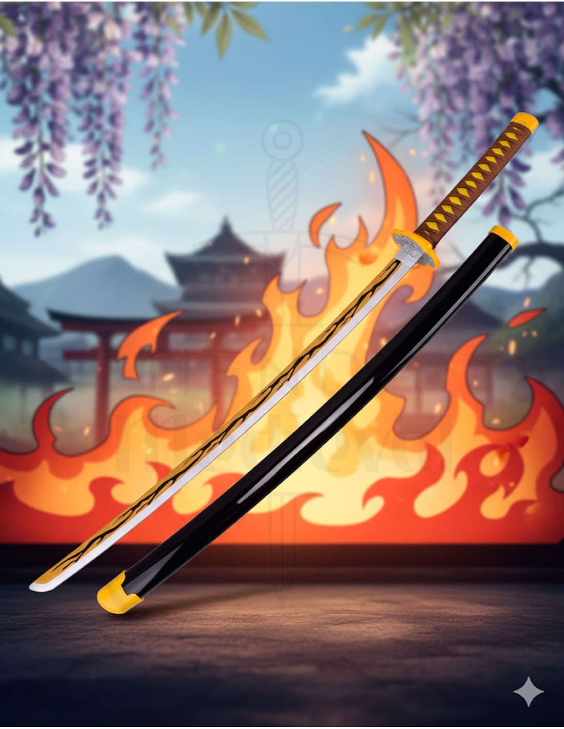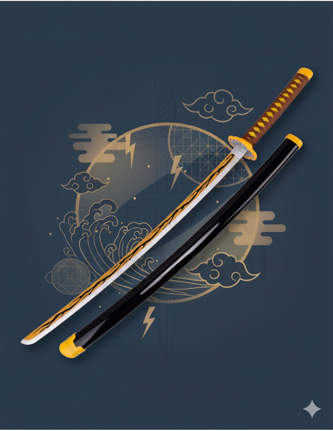 Die Tsuba, rund geformt mit gelbem Rand, zeigt ein geometrisches Design, das seinen Charakter im Universum von Kimetsu No Yaiba unterstreicht, während die schwarze Scheide einen eleganten Kontrast bietet, der seinen einzigartigen Stil betont. Mit nur 205 g ist sie bequem zu präsentieren und zu transportieren, wenn du möchtest.