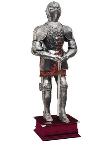 Entdecken Sie die kostbaren und aufwendigen Silber-Naturrüstungen mit Gravuren, die wir Ihnen anbieten. Mit seinem Granatanzug und dem Schwert in seinen Händen werden Sie sich wie ein wahrer Krieger fühlen. Bei dieser Rüstung handelt es sich um ein Kleidungsstück aus Metallteilen oder anderem widerstandsfähigem Material, das Ihren Körper im Kampf schützen soll.