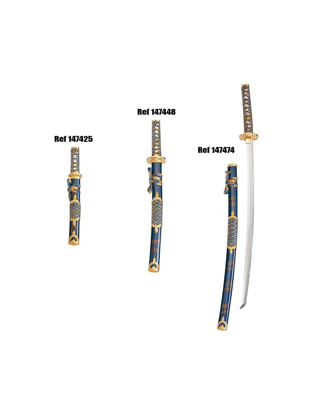 Entdecken Sie die faszinierende Welt der Dekoschwerter mit unserem Wakizashi mit blaugoldener Scheide und 440er Edelstahlklinge! Dieses beeindruckende Artefakt, hergestellt von Art Gladius in Toledo, Spanien, ist ein wahres Juwel für Sammler und Geschichtsliebhaber.