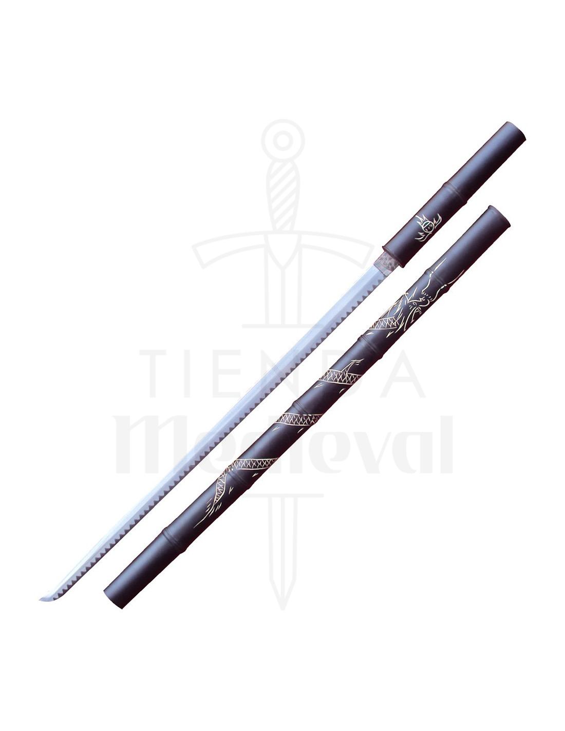 Seine Klinge aus Stahl zeigt ein glänzendes Design mit einer Kante, die die traditionelle japanische Ästhetik widerspiegelt – ideal für Liebhaber der asiatischen Kunst und Kultur. Die Scheide und der Griff aus Holz, verziert mit einem Drachenmuster in Goldtönen, verleihen einen künstlerischen Touch, der in jeder Sammlung oder Dekoration hervorsticht.