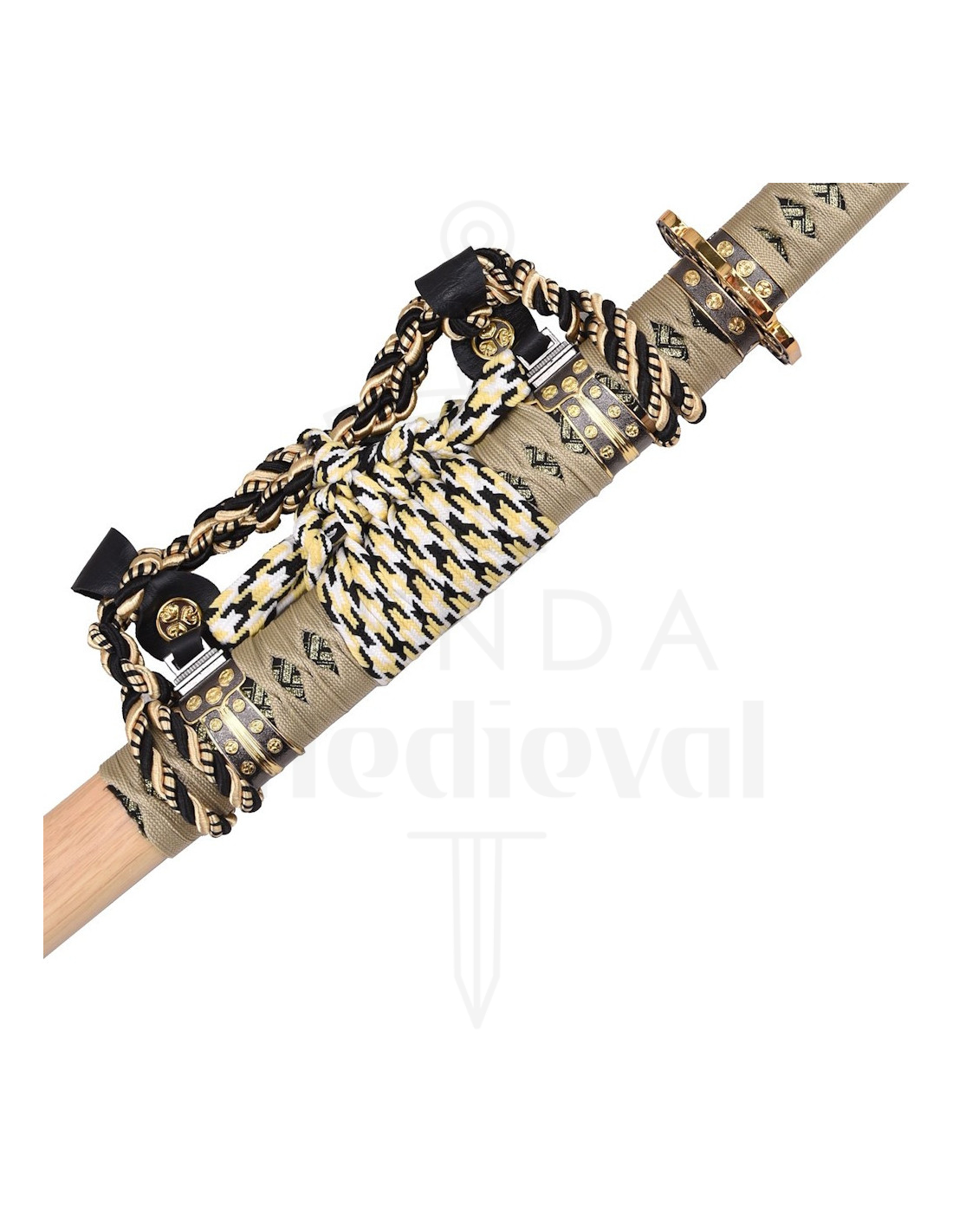 Die quadratische Guard, mit abgerundeten Kanten und Kreisen sowie floralen Motiven in Schwarz und Gold, wirkt wie ein zentrales Detail, das Tradition und Design ausbalanciert und einen dekorativen Akzent setzt, der das Stück aufwertet. Der Griff, umwickelt mit geflochtener beigefarbener Schnur im Kreuzmuster, bietet nicht nur ein handwerkliches Aussehen, sondern seine Textur hält den Griff fest, was die visuelle und reale Handhabung erleichtert. Die Scheide hat eine elegante Umhüllung in Beige, Schwarz und Weiß, gekrönt von goldenen Metallteilen, die das Schwert schützen und verschönern und es ideal für stilvolle Ausstellungen machen.
