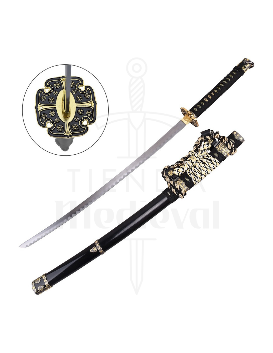 Wenn du eine schwarze traditionelle japanische Dekorationskatana mit Messingdetails kaufen möchtest, um sie zu verschenken oder eine Sammlung zu vervollständigen, erhältst du ein Stück, das Ästhetik und Tradition kombiniert. Inspiriert von der historischen Figur des Samurai, bietet sie eine Verbindung zu einem kulturellen Erbe, das für seinen Sinn für Ehre und handwerkliche Meisterschaft anerkannt ist, ohne dabei den ornamentalen Touch zu verlieren, der diese Katana einzigartig macht.