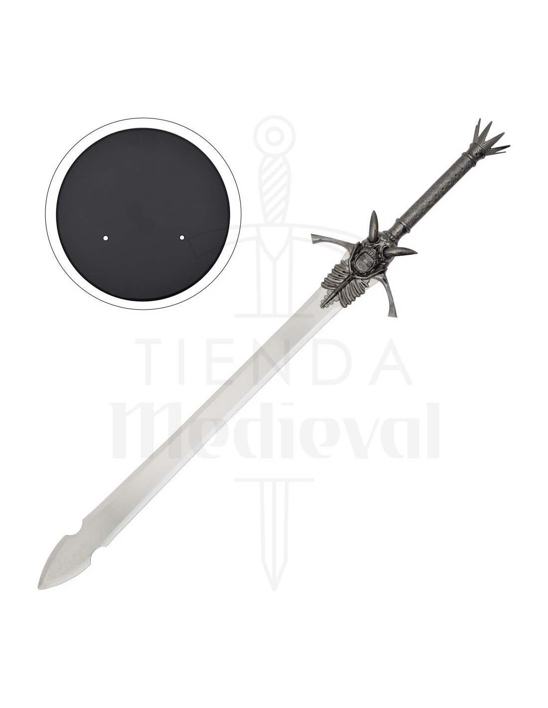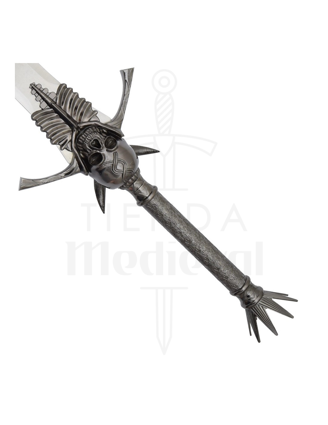 Das Design ist nicht nur ästhetisch, sondern verbessert auch die Erfahrung: Der dunkle, strukturierte Griff bietet einen festen Halt, um sie sicher zu posieren oder zu halten, während die mit Totenkopf und Rippen dekorierte Parierstange und die seitlichen Stacheln Charakter und ein theatrales Gefühl verleihen, das jedes Foto oder Display aufwertet. Die Krone aus Stacheln an der Spitze des Griffs fügt dem dramatischen Abschluss hinzu, der ihren gotischen und dekorativen Stil definiert.
