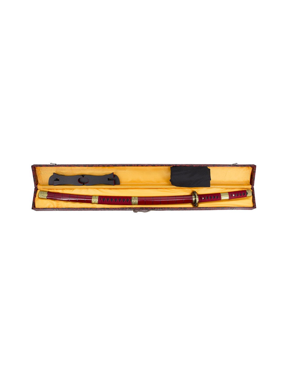 Die Katana wird mit einem eleganten Holz- und Samtbloster geliefert, um sie stolz ausstellen zu können, sowie mit einer Hülle und einer Präsentationsbox, die das Schwert sicher schützen und zur Schau stellen.