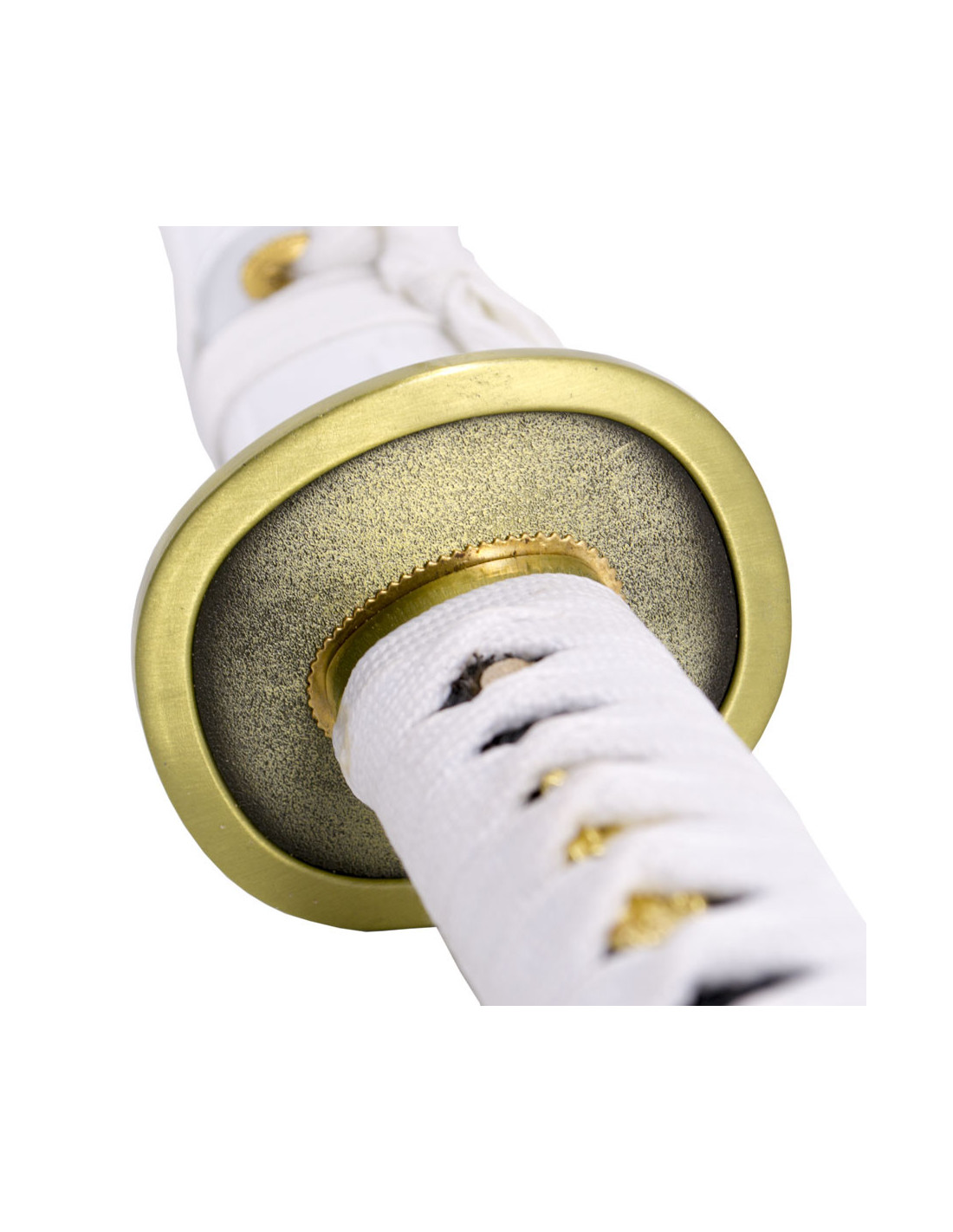 Der Griff ist mit weißen Paracord umwickelt und hat eine Nachbildung eines schwarzen Streifenleders, was einen bequemen und sicheren Griff bietet. Es beinhaltet eine Halterung, um es dekorativ in deinem Zuhause oder am Arbeitsplatz auszustellen.