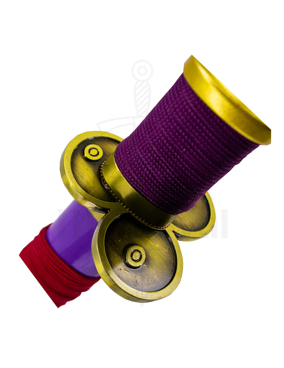 Der Griff der Katana ist lilafarben umwickelt und mit goldenen Akzenten verziert, was einen sicheren und komfortablen Halt bietet sowie ein attraktives Erscheinungsbild, das ihre Authentizität unterstreicht. Die passende Scheide in Lila mit goldenen Details und rotem Umschlag vervollständigt das Design und macht diese Katana zu einem Meisterwerk – sowohl funktional als auch ästhetisch.
