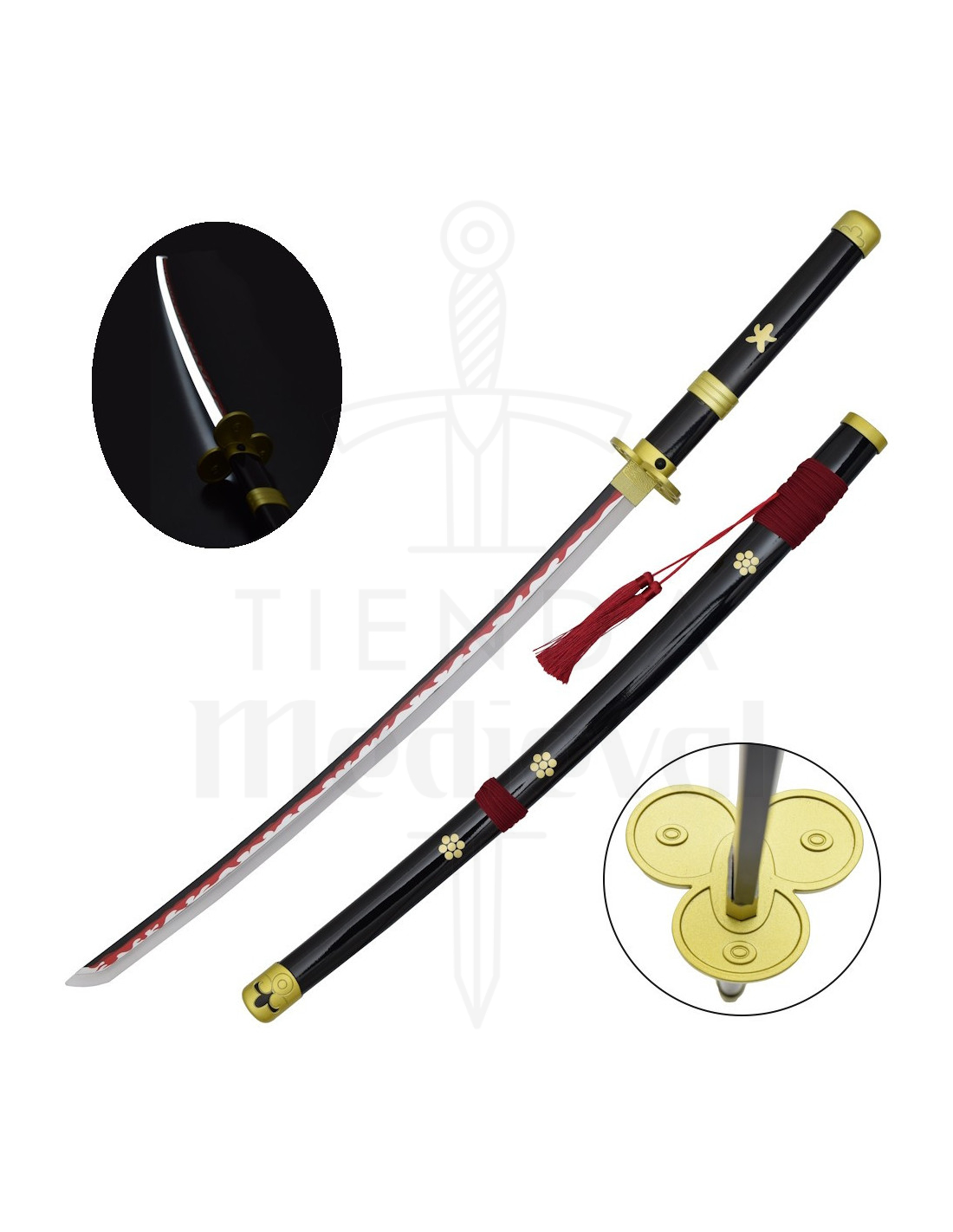 Möchten Sie ein Stück präsentieren, das Eleganz mit einem Hauch von Kraft verbindet? Diese dekorative Katana, inspiriert von Enma, dem berühmten Schwert von Zoro aus 'One Piece', ist perfekt für Anime-Fans und Sammler, die ihrer Dekoration einen einzigartigen Akzent verleihen möchten. Dank ihres Bambusdesigns und goldenen Details vermittelt sie eine authentische und auffällige Ästhetik, ist dabei leicht und einfach zu handhaben.