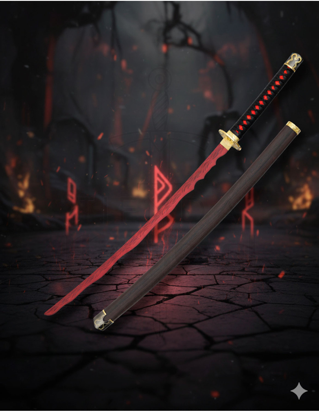 Seine 650 mm lange Stahlklinge in lebhaftem Rot zeigt ein einzigartiges Muster und evoziert die Kraft und das Geheimnis der Waffe im Spiel. Der robuste gold-schwarze Metall-Tsuba verleiht einen Hauch von Eleganz, während der geflochtene Griff in Schwarz und Rot nicht nur widerstandsfähig ist, sondern auch einen bequemen und auffälligen Griff bietet. Die dunkelbraune Holzscheide vervollständigt das Erscheinungsbild, ergänzt durch metallische Details, die den dekorativen Charakter unterstreichen.
