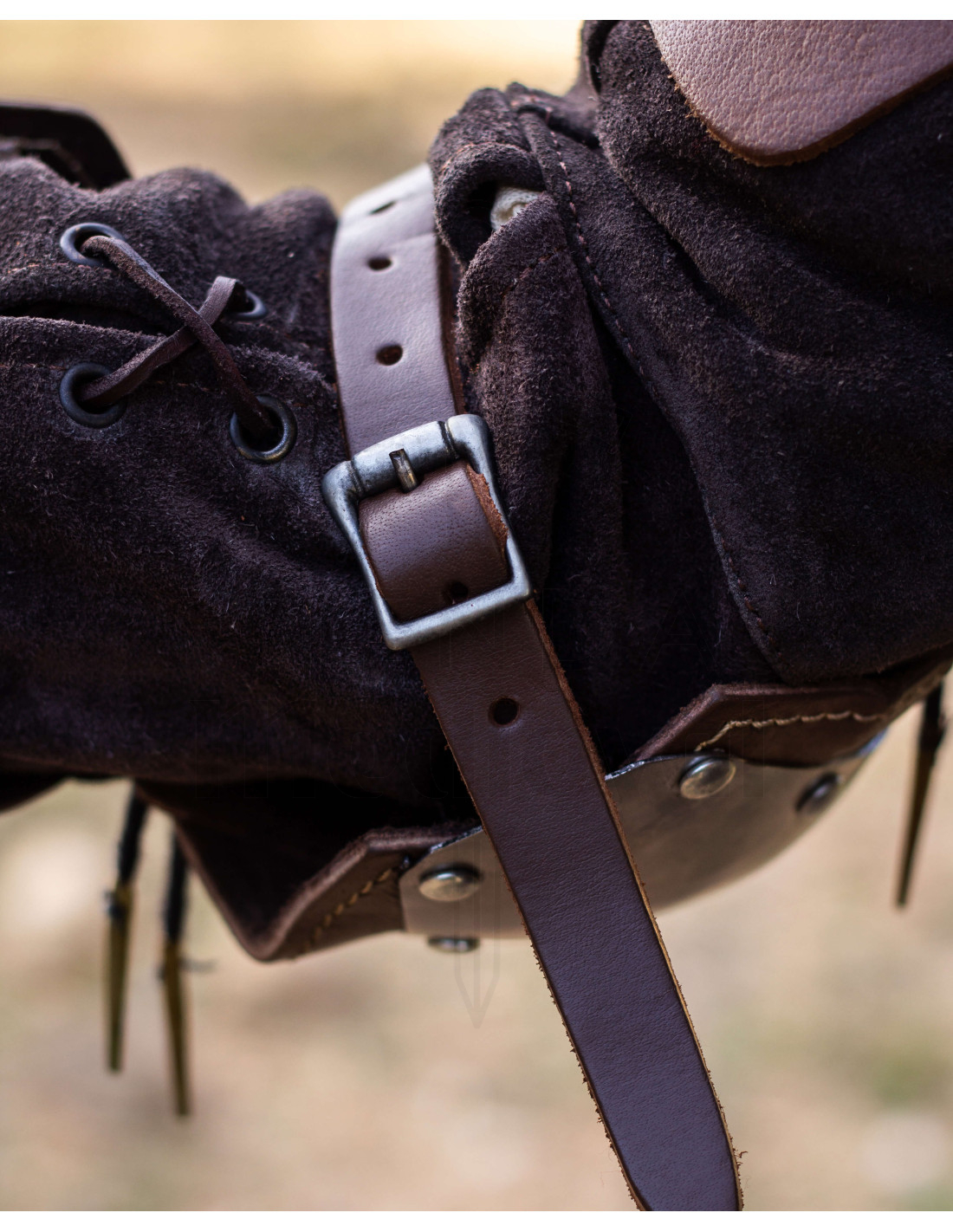 Die Kombination aus robustem braunem Leder mit genieteten Metallverstärkungen schützt das Ellbogengelenk, während die segmentierte Konstruktion jeder Armbewegung folgt, damit Sie kämpfen, klettern oder patrouillieren können, ohne die Rüstung als Hindernis zu spüren. Die ergonomische Ellbogenabdeckung verteilt Aufpralle, schenkt Vertrauen in anspruchsvollen Situationen und Komfort an langen Tagen.