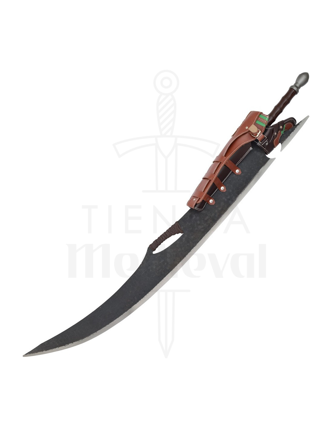 Die braune Scheide mit grünen und schwarzen Details, Riemen mit silbernen Schnallen und sichtbaren Nähten machen die Aufbewahrung zu einem Teil der Show und bieten eine elegante Lösung sowohl zum Aufhängen an der Wand als auch zum Transport zu Veranstaltungen. Alles ist so konzipiert, dass die Präsentation ebenso beeindruckend ist wie das Schwert selbst.