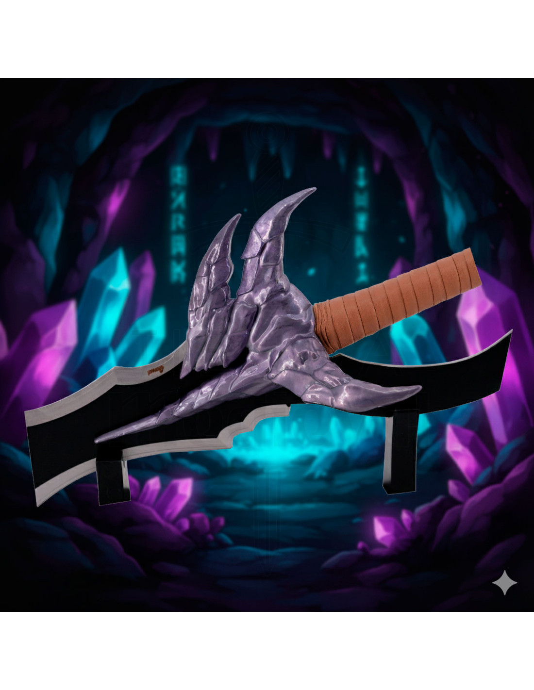 Seine Stahlklinge, in elegantem Schwarz mit satiniertem Finish, spiegelt die Liebe zum Detail und die Qualität in jedem Schnitt wider. Der Griff in lila Tönen verleiht einen Hauch von Geheimnis und Eleganz, während der in Braun geflochtene Griff eine bequeme und sichere Handhabung bietet – ideal zum Ausstellen oder für Cosplay. Es beinhaltet eine Halterung, um es stilvoll in Ihrem Lieblingsraum zu präsentieren, sodass seine Präsenz in jeder Sammlung oder Veranstaltung hervorsticht.