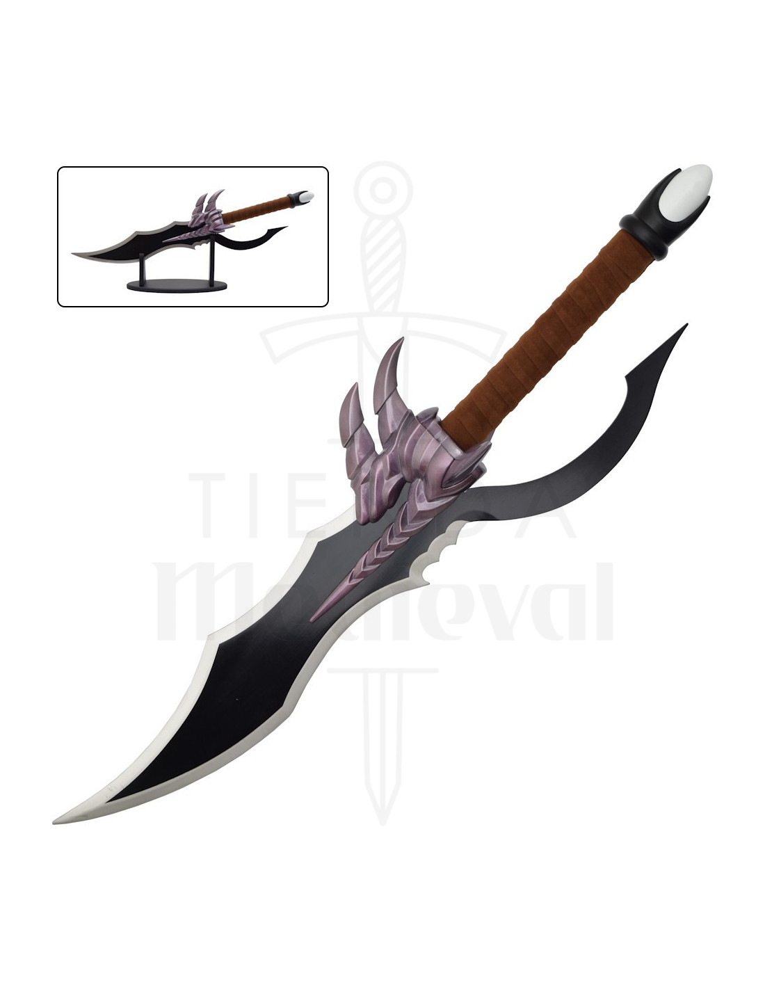 Mit einer aggressiven und schlanken Silhouette, einem schwarzen Blatt mit silberner Schneide und unregelmäßigen Konturen verleiht es Dynamik und Charakter – perfekt für diejenigen, die ein dekoratives Element suchen, das für sich spricht. Das dreidimensionale Detail in metallischem Violett, das eine Klaue simuliert, verleiht Tiefe und ein beeindruckendes Finish, das in jedem Schaukasten oder an der Wand hervorsticht.