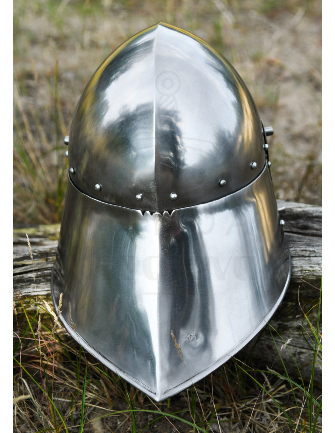 Die funktionale deutsche Kopfbedeckung aus dem Jahr 1480 verfügt über ein verstellbares Visier, mit dem Sie Ihr Gesicht während der Schlachten schützen können. Darüber hinaus verfügt es über einen Kinnriemen, mit dem es sicher am Kopf befestigt werden kann.