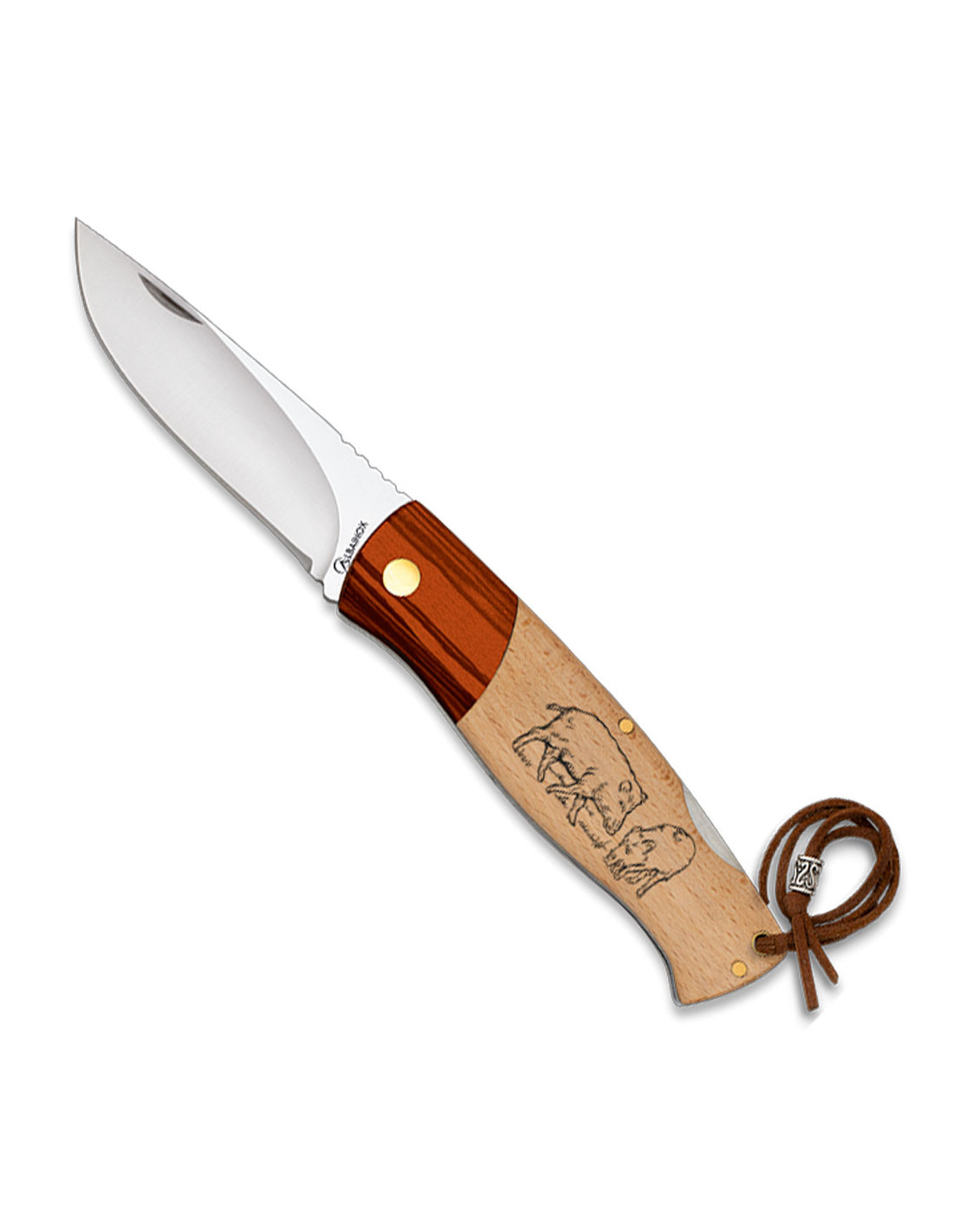 Der Griff aus natürlichem Holz in hellen und dunklen Tönen, akzentuiert mit metallischen Details und einem roten Virola-Schutz, verleiht dem Messer eine markante und ergonomische Note für eine komfortable und sichere Handhabung. Dank seines Back Lock-Verriegelungssystems können Sie es während des Gebrauchs sicherer bedienen.