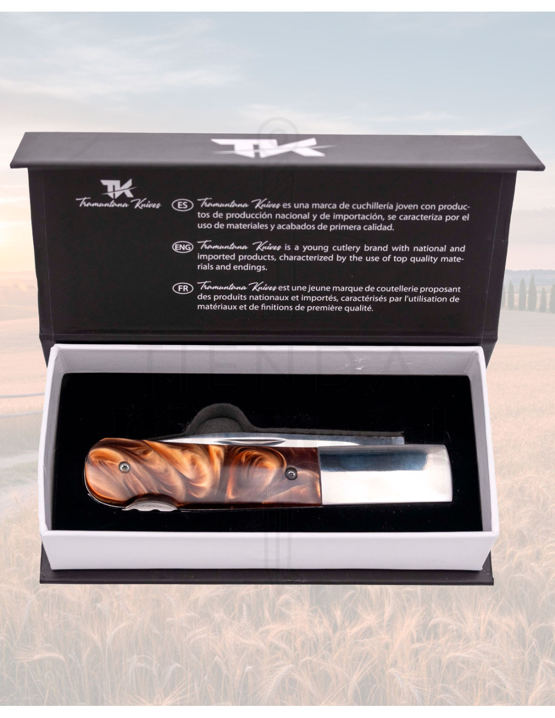 Wenn du ein Stück suchst, das Tradition und modernes Finish kombiniert, warte nicht länger mit dem Kauf des Tramuntana-Messers 10,2 cm, VG10 und mit Sicherheitsverriegelung, eine Option, die sich durch ihre spiegelpolierte Klinge, die Ästhetik des Griffs und die Sicherheit des Verschlusses auszeichnet, gemacht, um dich Tag für Tag stilvoll zu begleiten.
