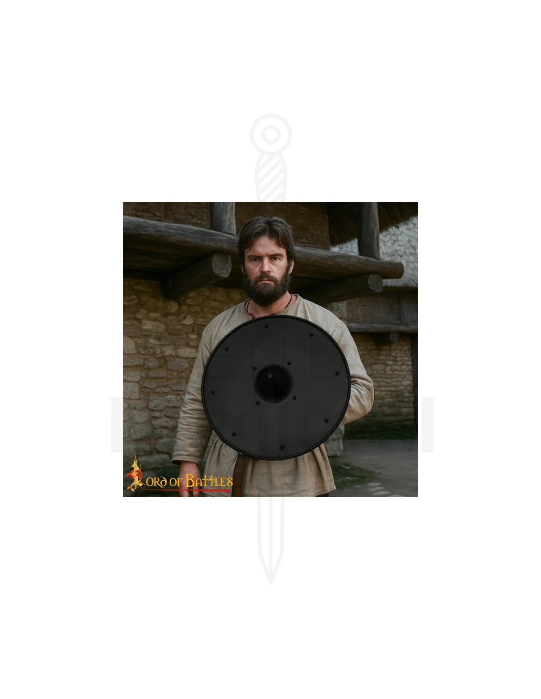 Handgeschmiedet aus Stahl, bietet dieser Wikinger Schild ein authentisches Gefühl und eine solide Reaktion bei Aufprällen, ohne auf die nötige Manövrierfähigkeit für präzise Bewegungen zu verzichten. Seine natürliche Oberfläche und die glatte, schwarze Farbe mit sichtbaren Nieten vermitteln die kriegerische Ästhetik, die du suchst, während der strukturierte Rand als Stoßdämpfer fungiert und sowohl das Schild als auch seinen Träger schützt. Der zentrale Schlag in Form einer Erhebung definiert nicht nur sein klassisches Erscheinungsbild, sondern schützt auch die Hand und ermöglicht sicherere Abwehrpositionen.