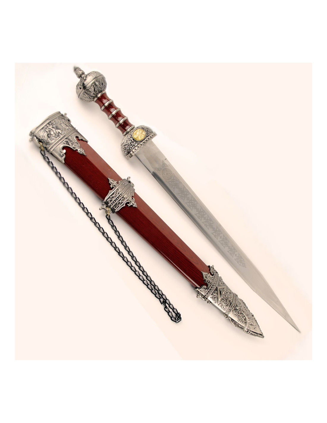 Hergestellt mit einer robusten Klinge aus 440er Edelstahl, bietet dieses Gladius Langlebigkeit und ein authentisches Design, das sein historisches Erbe ehrt. Sein Gewicht und seine Maße machen es imposant und echt, perfekt um die Bewegungen der mutigen römischen Krieger nachzuahmen. Es beinhaltet eine Scheide mit Kette, um es an deinem Gürtel zu befestigen – ideal sowohl für die Ausstellung zu Hause als auch für den Einsatz bei Reenactment-Veranstaltungen, sodass es garantiert alle Blicke auf sich zieht.