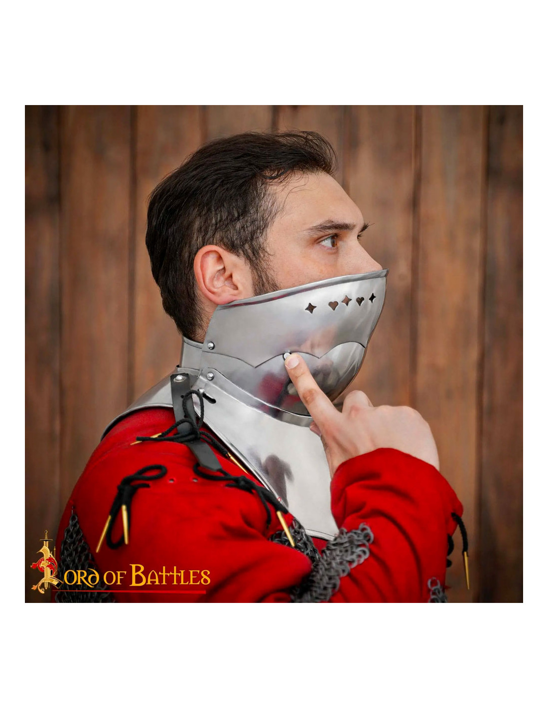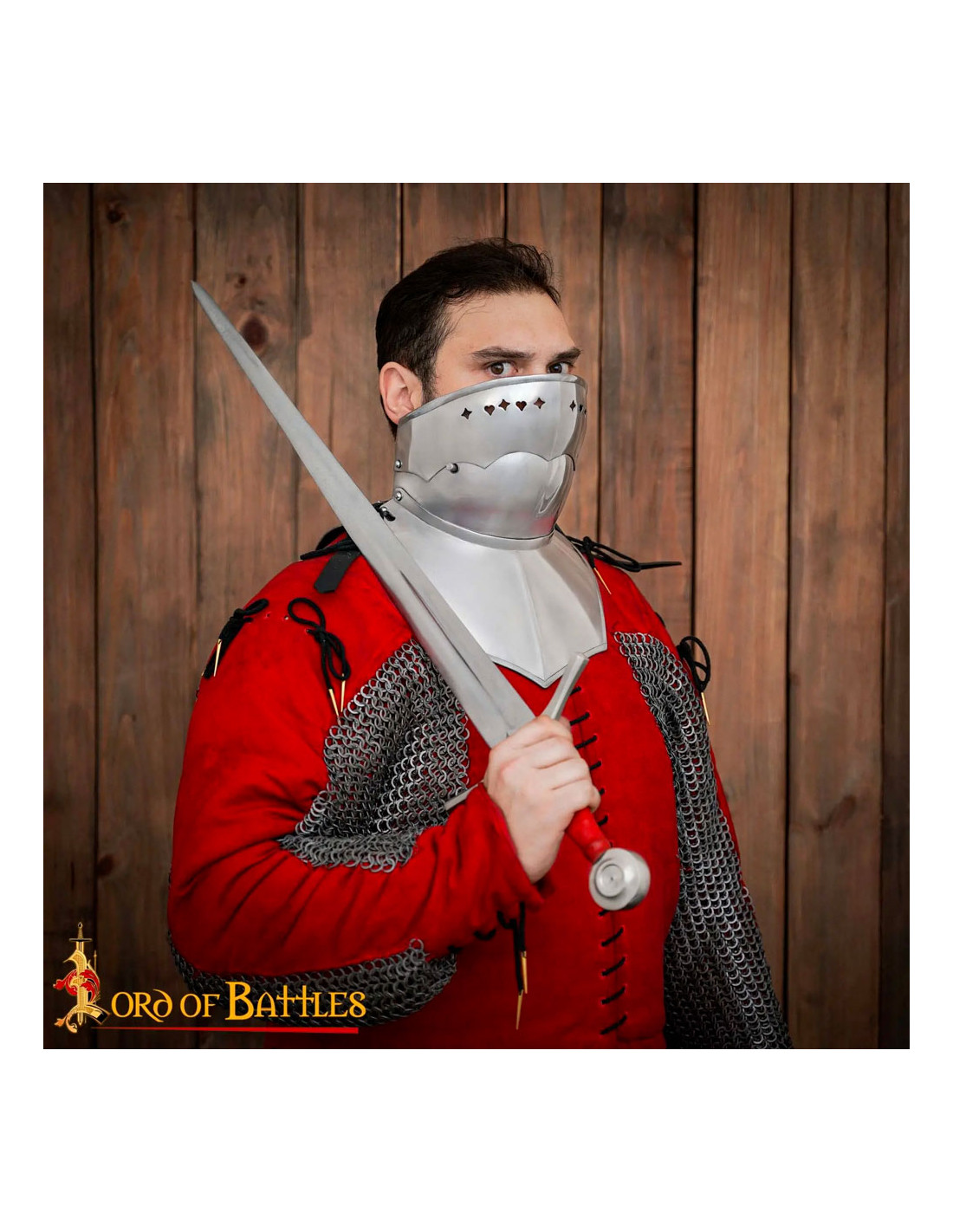 Ein vollständig geschlossener Helm wäre nicht so effizient wie dieser Ritterkragen in Kombination mit seinem treuen Helm! Dieser Stil wurde vom zweiten Viertel des 15. Jahrhunderts bis zur Renaissance, als der geschlossene Helm eingeführt wurde, von den meisten schwer gepanzerten Rittern bevorzugt. Es ermöglichte dem Träger, den Helm leicht abzunehmen, wenn er nicht benötigt wurde, und bot erheblichen Schutz auf dem Schlachtfeld.