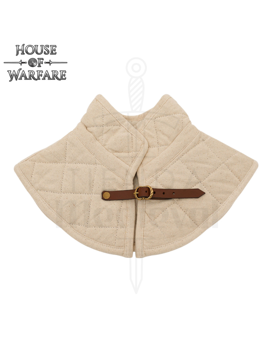 Der hohe Kragen und die gepolsterten Paneele auf den Schultern schützen den Hals, das Schlüsselbein und die obere Brust, und bieten zusätzlichen Schutz, wenn sie mit anderen Rüstungsteilen kombiniert oder separat getragen werden. Der verstellbare Riemen mit Metallschnalle sorgt für einen festen und sicheren Sitz, bereit für die Anforderungen von HEMA, LARP, SCA oder szenischem Kampf.