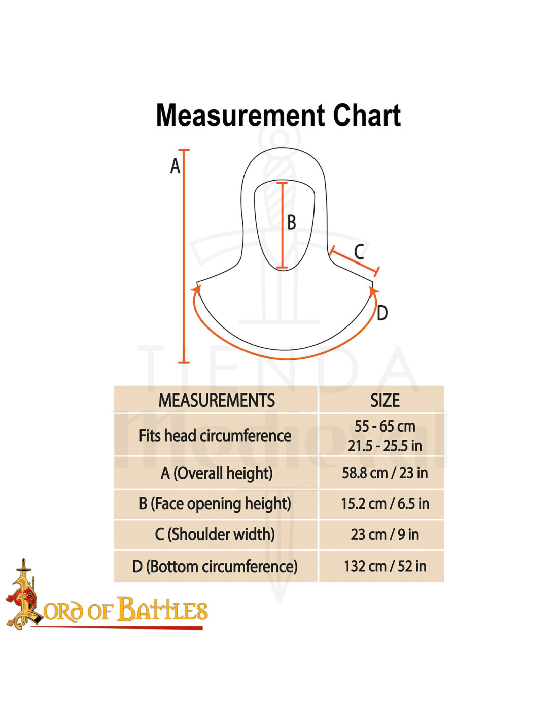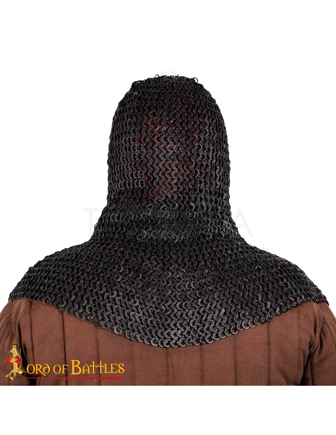 Dieses Stück verwandelt traditionellen Schutz in ein komfortables und praktisches Erlebnis, dank des geflochtenen Gewebes, das sich der Kontur von Kopf, Hals und Schultern anpasst, ohne die Mobilität einzuschränken. Die dunkle Oberfläche verhindert unerwünschte Reflexionen bei nächtlichen Veranstaltungen und verleiht einen rauen und bearbeiteten Look, der jede historische Nachstellung oder dramatische Charakterisierung aufwertet.