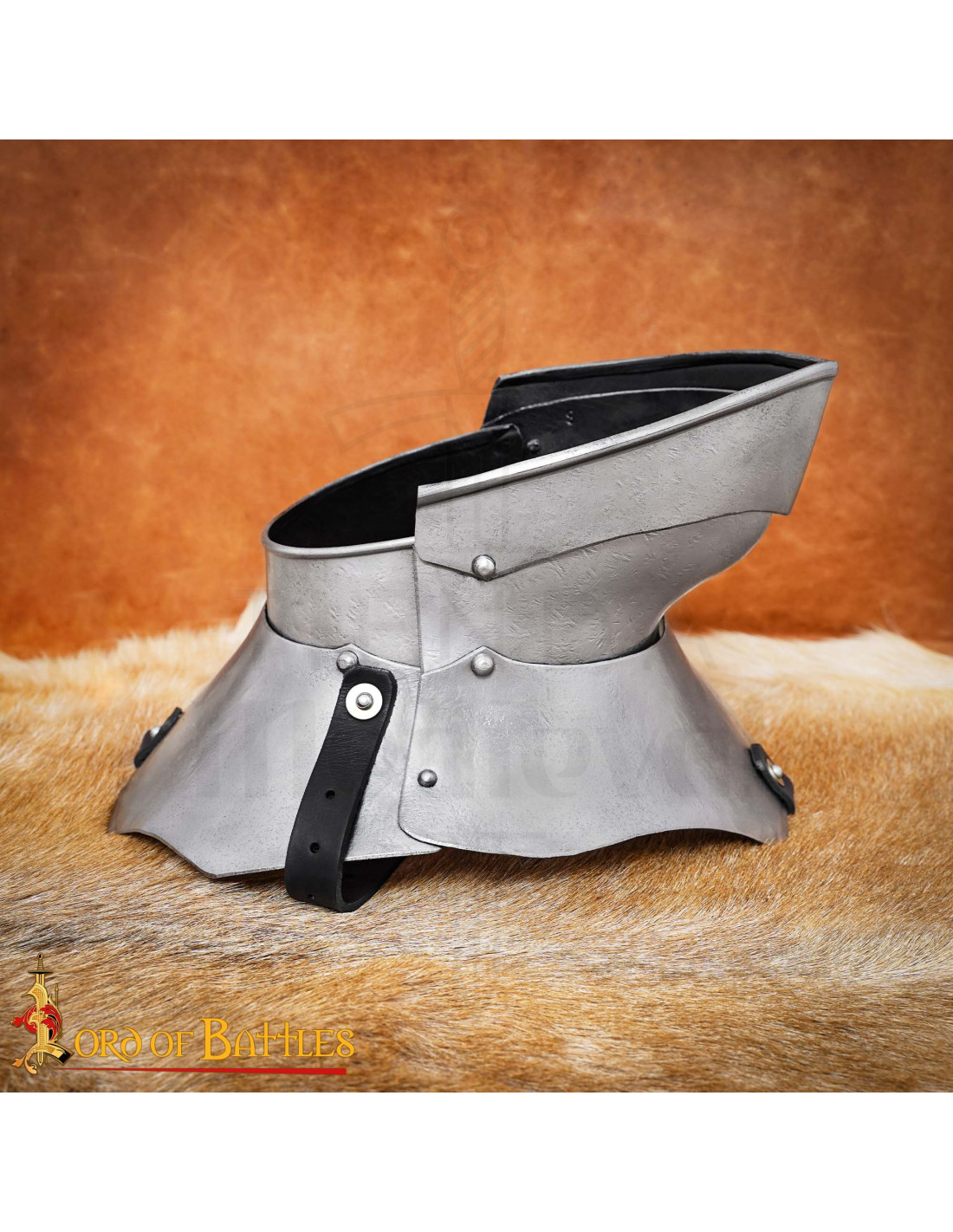 Dieser handgefertigte Rundhalskragen vereint Schutz und Freiheit dank seines beweglichen Bevors, der es ermöglicht, die Vorderplatte mühelos anzuheben und die Beweglichkeit zu entfalten, wenn du sie am meisten benötigst. Das Design schützt den Hals und den oberen Brustbereich und bietet ein Gefühl der Sicherheit, das bei langen Veranstaltungen oder Proben nicht belastet.