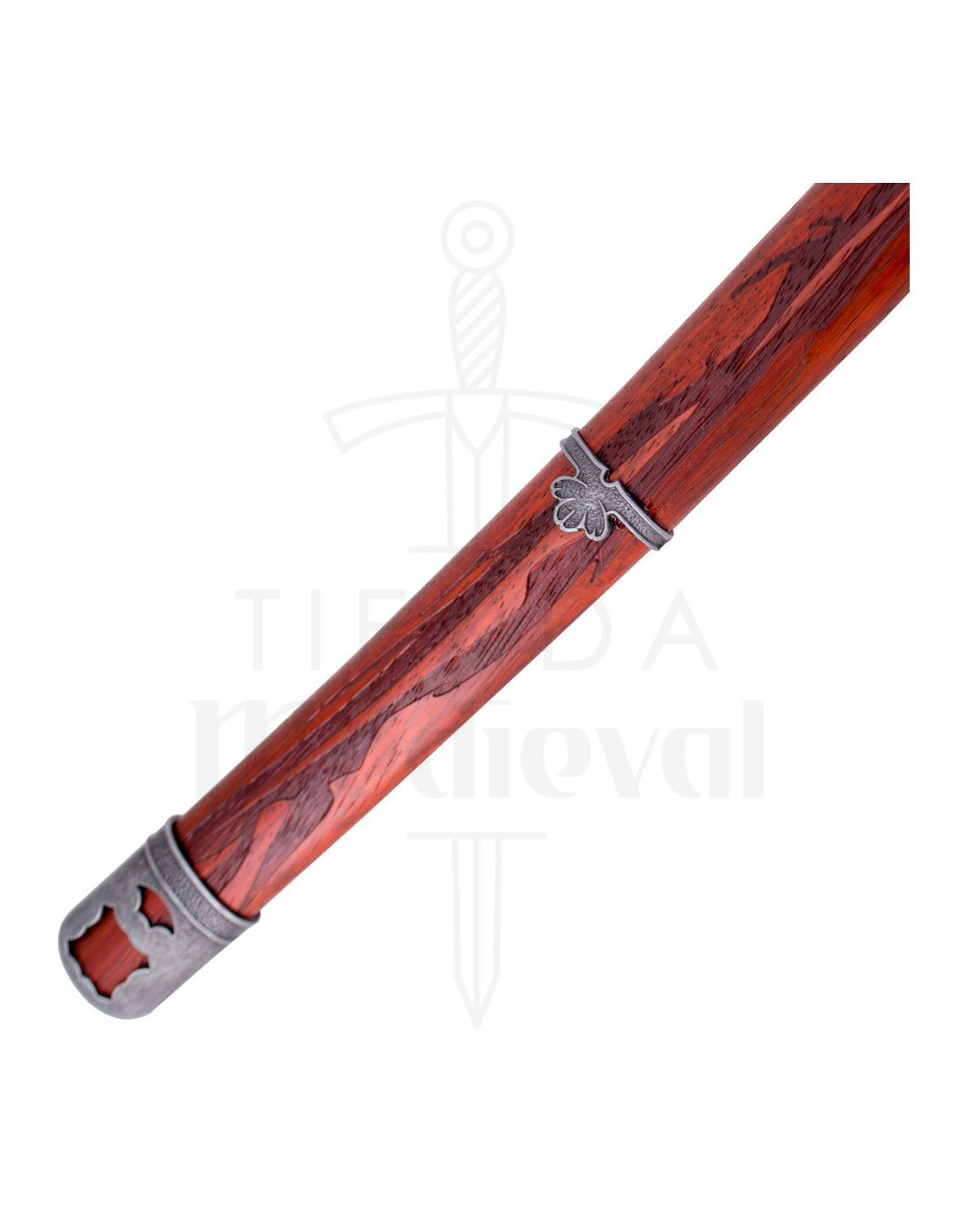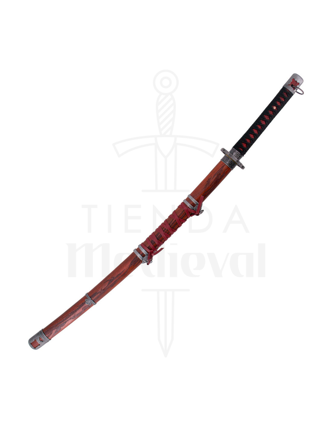 Der federrote Griff mit schwarzen Schnürungen, mit Imitation rotem Rayas-Leder, sorgt für einen festen und bequemen Griff und hebt sich durch sein ästhetisches Detail hervor, das an die japanische Tradition erinnert. Die Schnürung, typisch für hochwertige Katanas, garantiert eine optimale Kontrolle, sowohl bei der Ausstellung als auch im praktischen Gebrauch.
