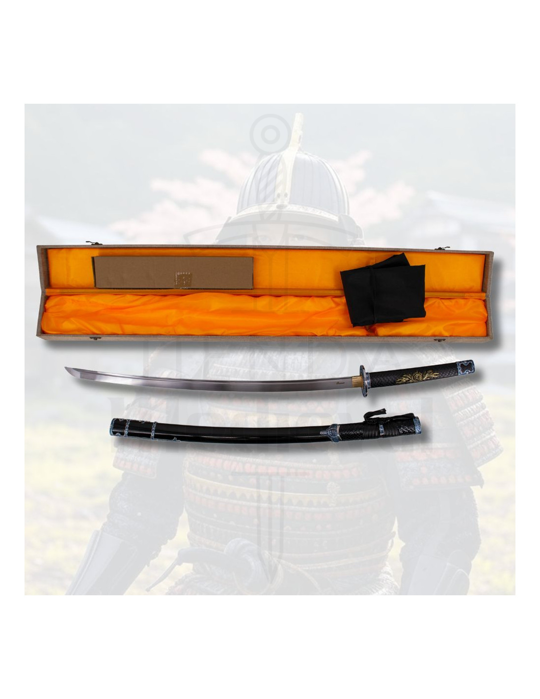 Der runde Metall Tsuba fügt Robustheit und Stil hinzu und bietet den nötigen Schutz bei der Benutzung. Der beigefügte Ständer ermöglicht es, die Klinge stolz auszustellen und in einwandfreiem Zustand zu halten.