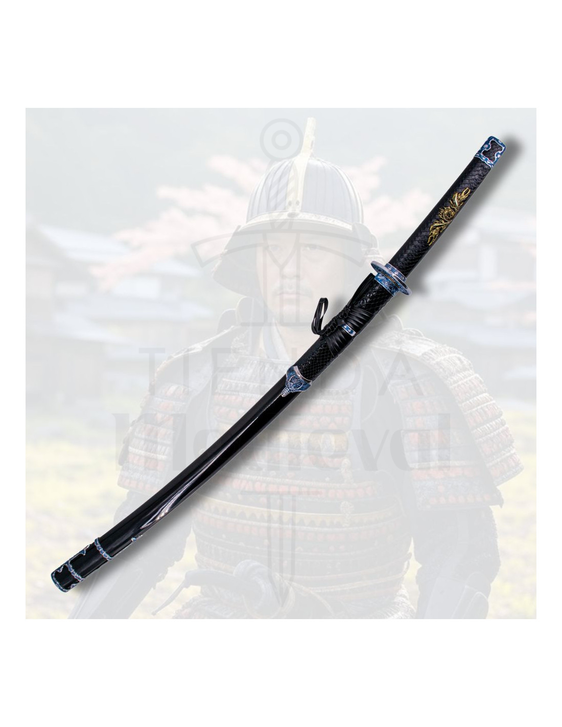 Der Griff, bezogen mit schwarzem Poly-Leder mit goldenen und blauen Details, sorgt für einen festen und bequemen Halt und gewährleistet die vollständige Kontrolle bei jeder Bewegung. Das sorgfältige Flechtmuster und die subtilen Schlangenhaut-Imitate verleihen ihm eine charakteristische und raffinierte Ästhetik. Der lackierte schwarze Scheide, dekoriert mit blauen Details, die die Textur einer Schlange imitieren, unterstreicht sein elegantes und kraftvolles Wesen.