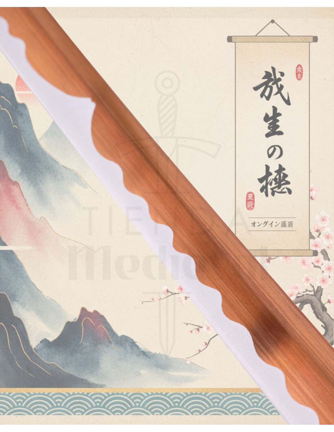 Stellen Sie sich ein Stück vor, das die traditionelle japanische Ästhetik mit echter Leistung verbindet, bereit, stolz ausgestellt zu werden und bei Bedarf effizient zu funktionieren. Diese Katana verfügt über eine gebogene Klinge mit einem markanten wellenförmigen Muster entlang der Schneide, das sowohl Schönheit als auch ein Gefühl kontrollierten und scharfen Schnitts vermittelt.