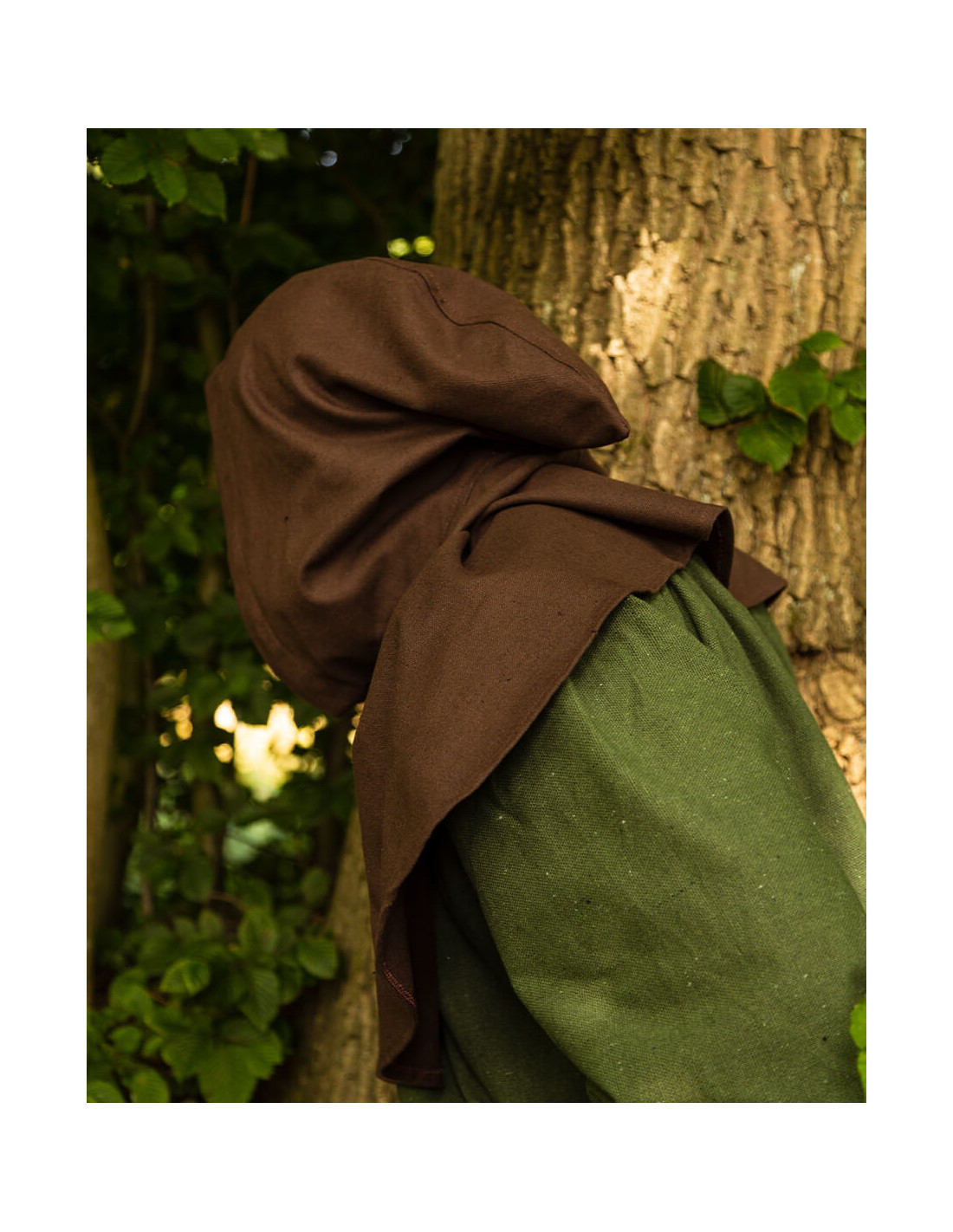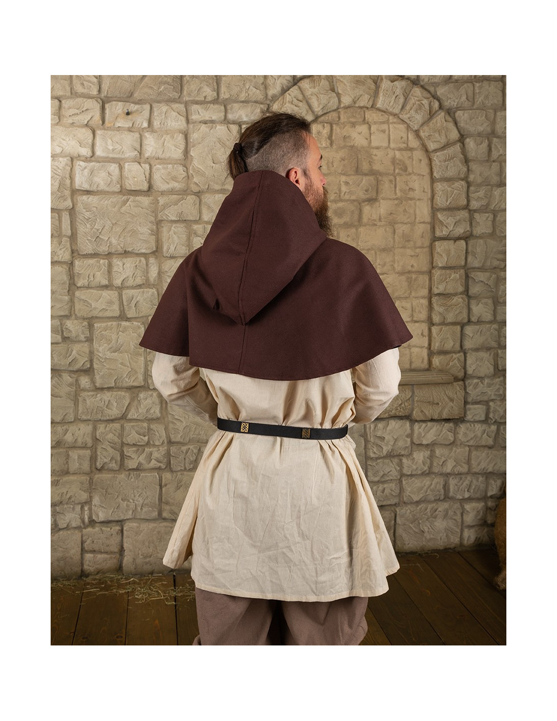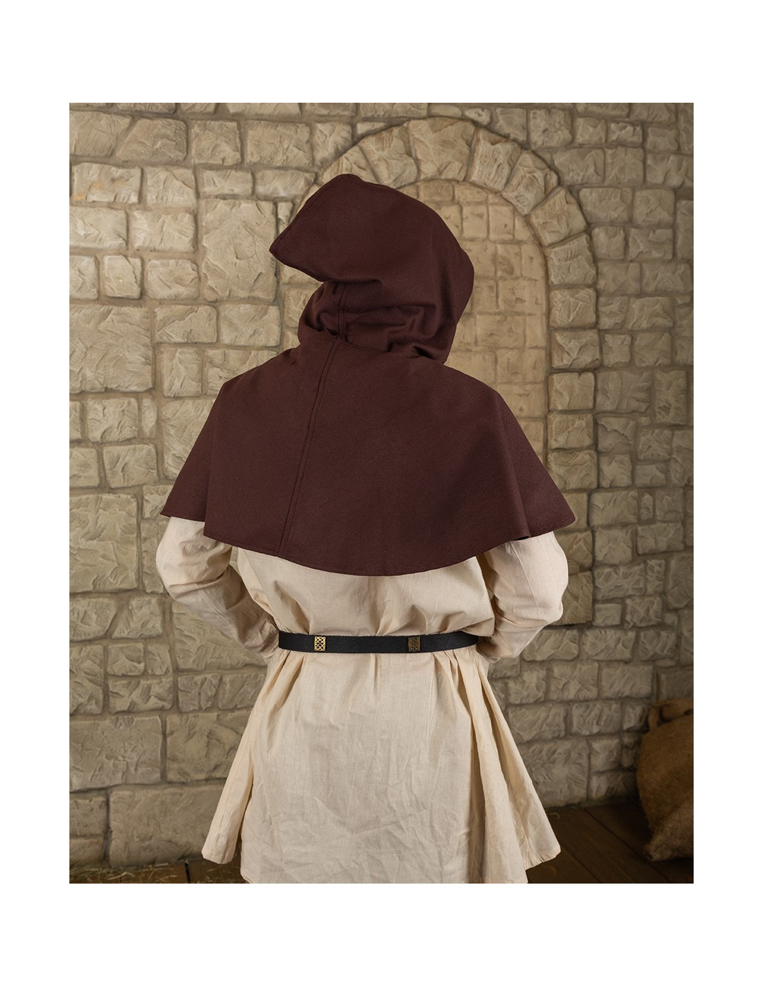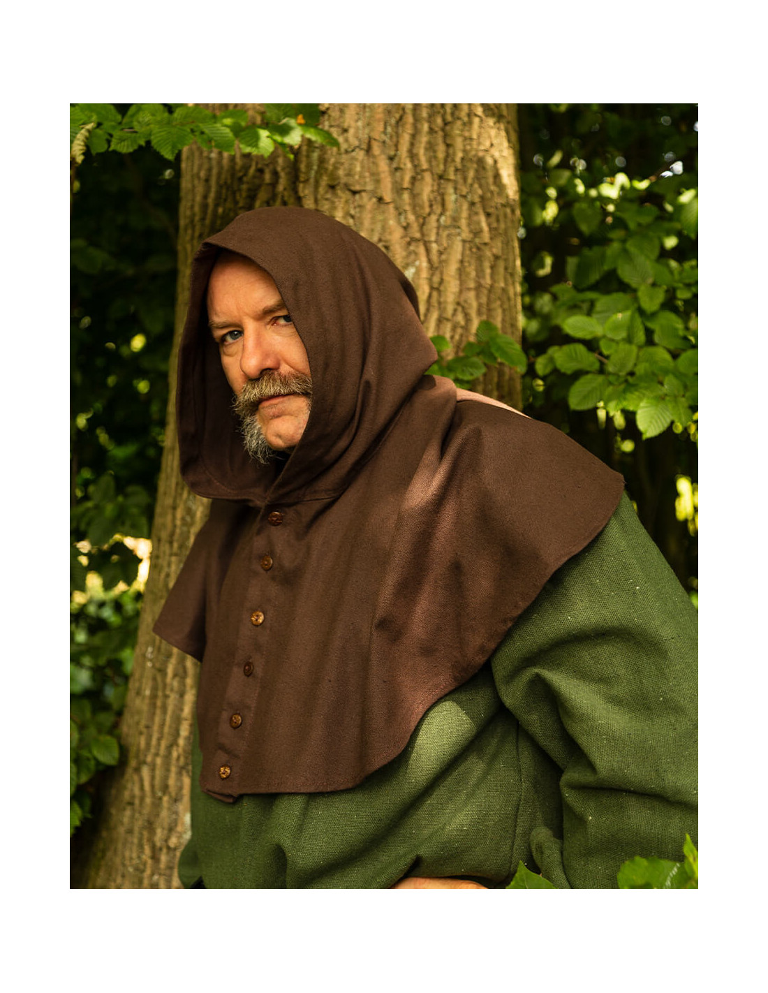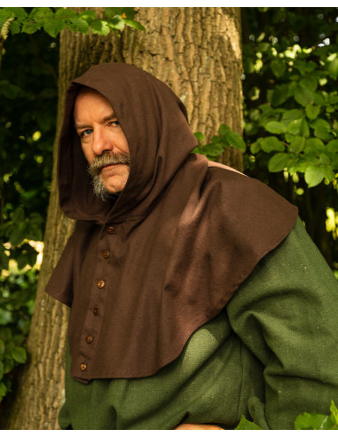 Entdecken Sie die elegante Gugel- oder Nordische Haube Notker-Modell in Braun! Manchmal kann eine Kapuze zu warm sein, Sie möchten sie aber trotzdem als Sonnenschutz verwenden. -Notker- ist für alle Wetterbedingungen geeignet. Mit seiner Reihe von Kokosnussknöpfen können Sie ihn an jede Temperatur anpassen. Ob ganz geschlossen bei schlechtem Wetter, halb offen in der Taverne oder als kühles Kleidungsstück an warmen Tagen – Notker ist vielseitig einsetzbar.