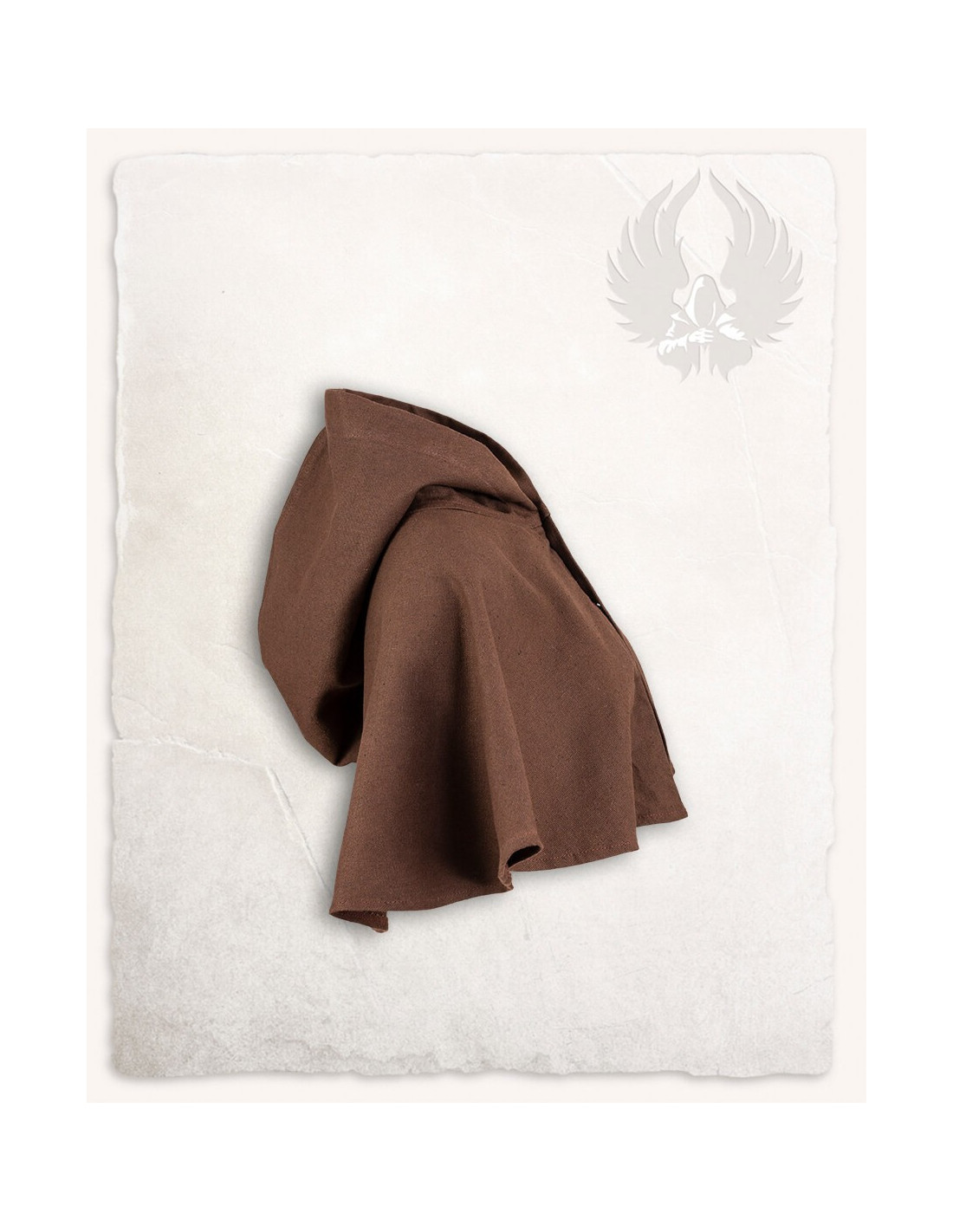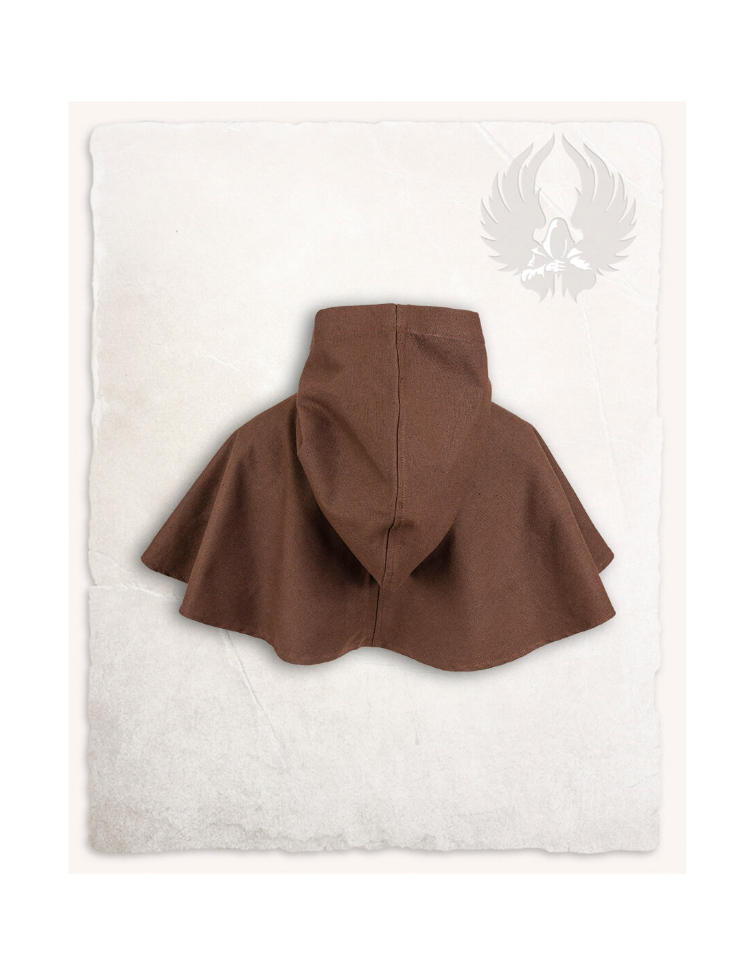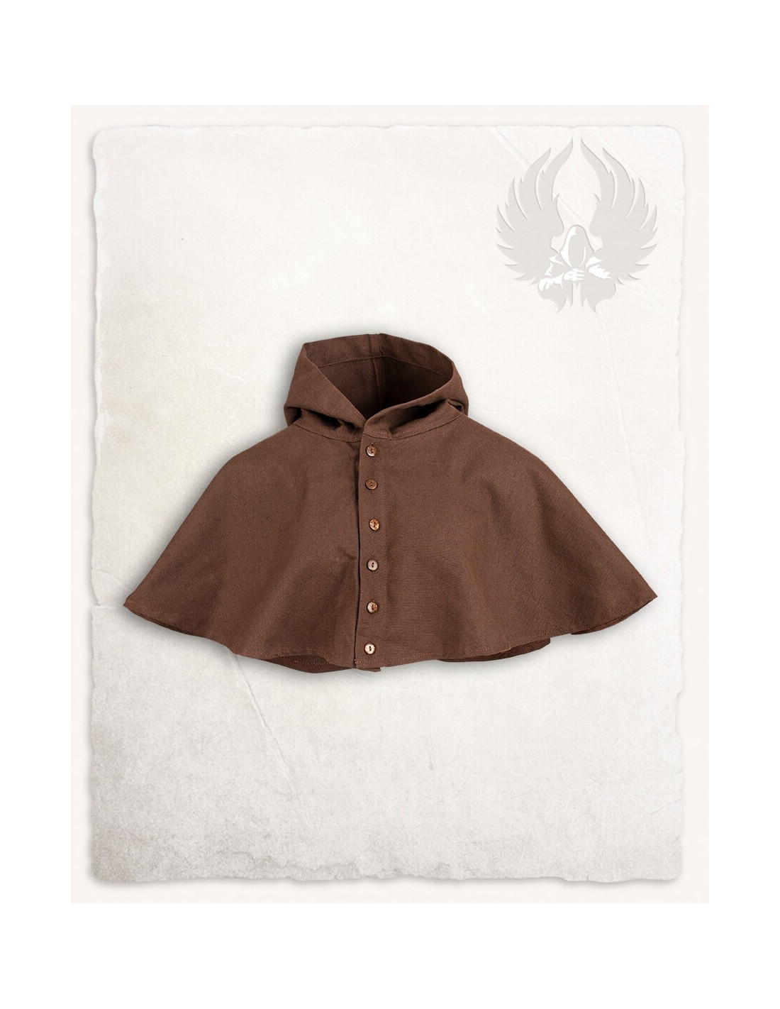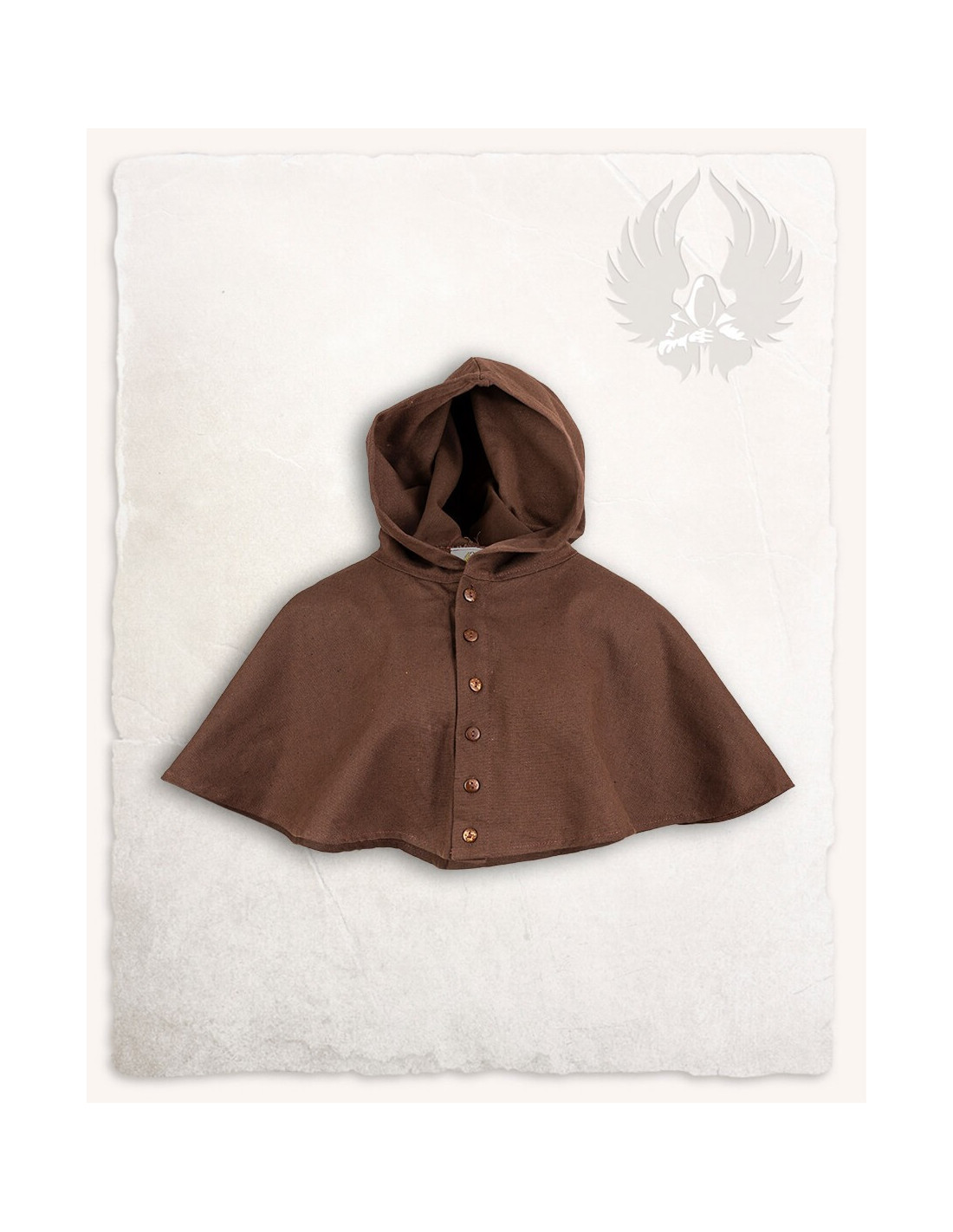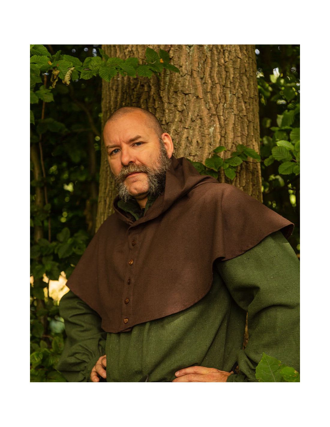 Entdecken Sie die elegante Gugel- oder Nordische Haube Notker-Modell in Braun! Manchmal kann eine Kapuze zu warm sein, Sie möchten sie aber trotzdem als Sonnenschutz verwenden. -Notker- ist für alle Wetterbedingungen geeignet. Mit seiner Reihe von Kokosnussknöpfen können Sie ihn an jede Temperatur anpassen. Ob ganz geschlossen bei schlechtem Wetter, halb offen in der Taverne oder als kühles Kleidungsstück an warmen Tagen – Notker ist vielseitig einsetzbar.