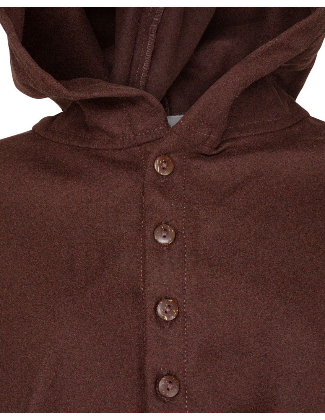 Hergestellt aus einer weichen Mischung aus 50% Wolle, 30% Polyester und 20% Viskose, bietet sein Stoff ein angenehmes Tragegefühl und eine warme, aber nicht übermäßige Schutzfunktion. Die große, gerade Kapuze mit weitem Schnitt sorgt für Komfort und einfache Anpassung an die Temperatur, dank ihrer praktischen Öffnung mit Kokosknöpfen. Sie können sie an kalten Tagen geschlossen tragen oder an milden Tagen halb offen, um einen funktionalen und anpassungsfähigen Stil zu erzielen – perfekt für Outdoor-Aktivitäten oder als Kostümzubehör.