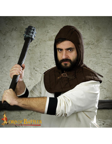 Das Design mit quadratischer Polsterung sorgt nicht nur für ein visuell ansprechendes historisches Finish, sondern verteilt auch die Stöße besser und bietet einen zuverlässigen Schutz in verwundbaren Bereichen. Die Verlängerung, die den Hals, die Schultern und den oberen Brustbereich bedeckt, fügt eine zusätzliche Barriere gegen abgelenkte Schläge hinzu, verbessert den globalen Schutz, ohne die Beweglichkeit der Arme einzuschränken.