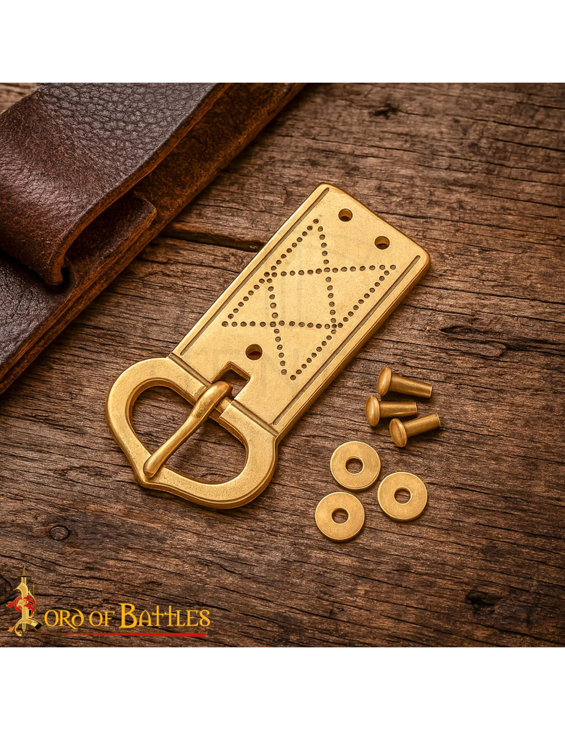 Die Schnalle bietet den polierten, goldenen Glanz, der sofort Präsenz und Eleganz verleiht und perfekt ist, um schmale Gürtel, Taschen oder zeitgenössische Accessoires zu akzentuieren. Ihr sternförmiges, gepunktetes geometrisches Design, eingekapselt in einem rechteckigen Rahmen, fügt einen visuellen Reiz hinzu, der Aufmerksamkeit erregt, ohne zu überladen und den Geschmack sowie die distinguierte Stellung zu vermitteln, die im Spätmittelalter mit Position und Raffinesse assoziiert wurde.