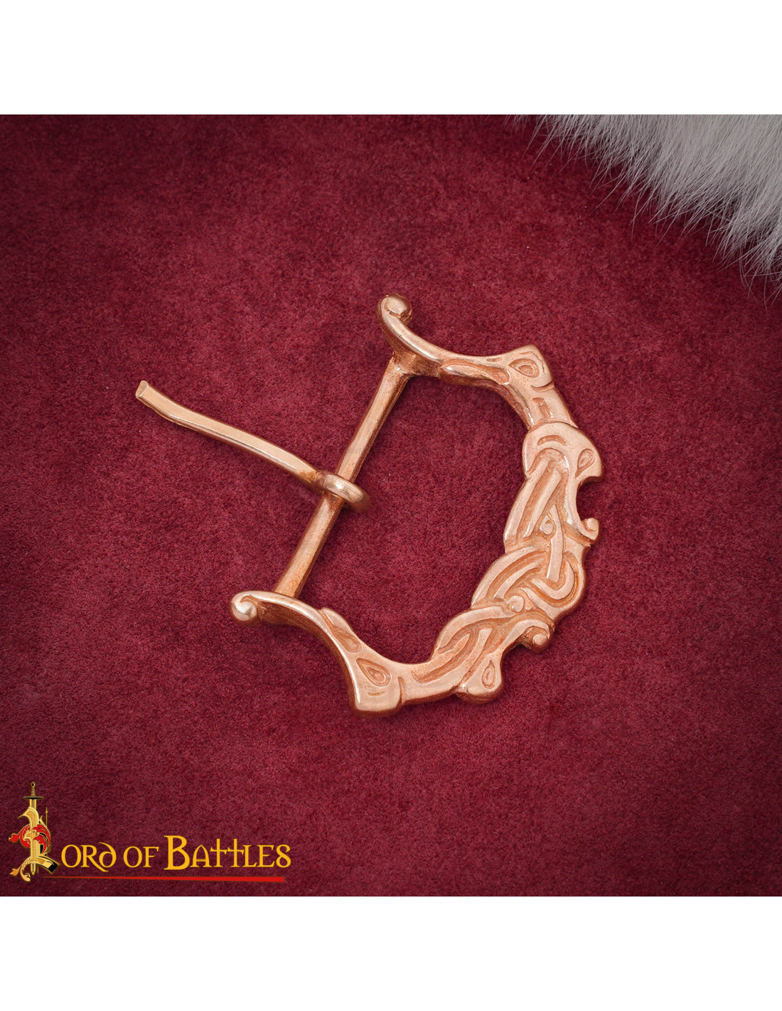 Diese Schnalle, inspiriert von nordischen Funden aus den Jahrhunderten IX bis XI, bietet den visuellen und funktionalen Eindruck, den du suchst, dank ihrer geschwungenen Silhouette und der geflochtenen Arbeit, die an die schlangenförmigen Knoten der Wikinger-Metallverarbeitung erinnert. Der polierte Bronze-Finish verleiht Präsenz, während die bewegliche Schlaufe den Verschluss sicher fixiert, sodass sie nicht nur authentisch aussieht, sondern auch den täglichen Anforderungen eines strapazierfähigen Accessoires gerecht wird.