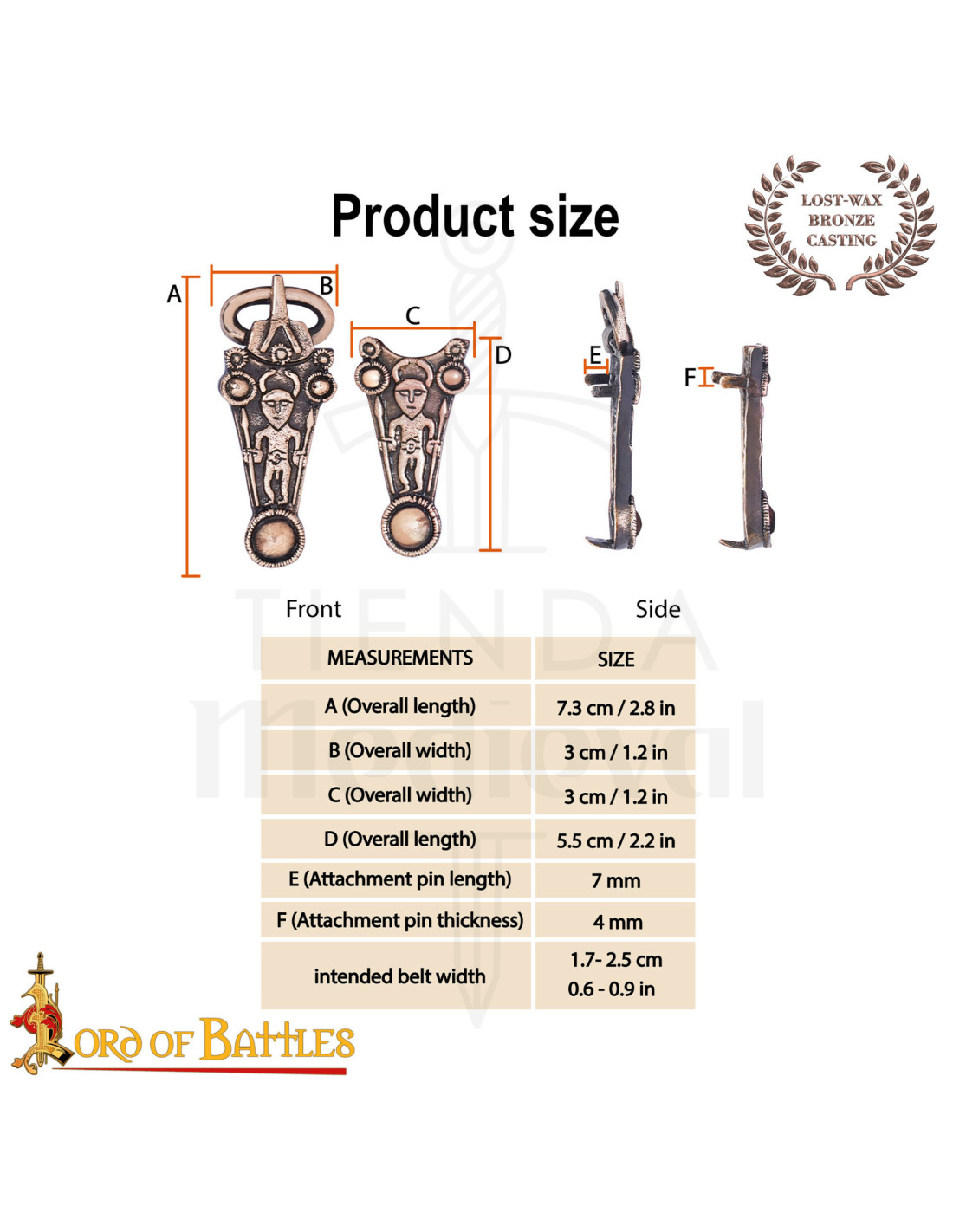 Diese Schnalle und der Abschluss aus Bronzeguss spiegeln treu den ornamentalen Geschmack der 8. bis 10. Jahrhunderte wider, mit anthropomorphen Figuren und Sonnenscheiben, die jedem Outfit einen rituellen und schützenden Charakter verleihen. Das patinierte Finish und die leichte Unregelmäßigkeit der Oberfläche vermitteln den Wert von Handarbeit, wodurch jedes Stück einzigartig wird und Ihren Accessoires eine authentische Präsenz mit Charakter verleiht.