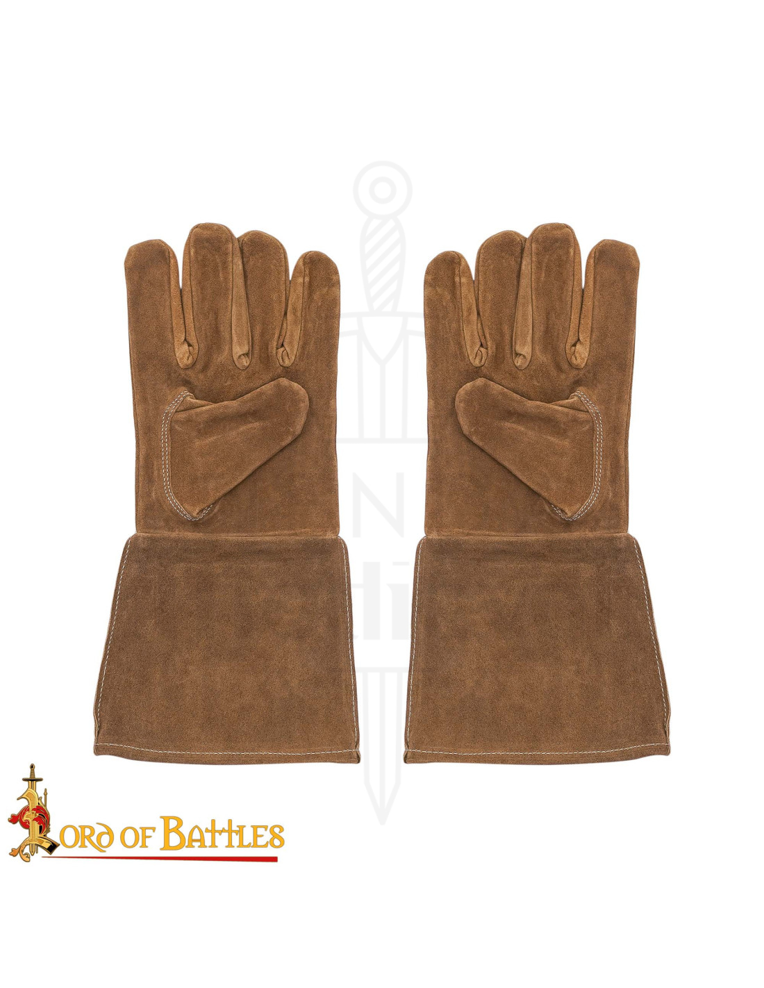 Suchen Sie Schutz mit Stil und Authentizität? Diese mittelalterlichen Handschuhe aus braunem Wildleder ermöglichen es Ihnen, vergangene Epochen mit einem Hauch von Eleganz und Funktionalität wiederzubeleben. Mit ihrem klassischen Design bedecken sie außerdem die Handgelenke und Teile der Unterarme dank ihrer langen Bündchen und bieten zusätzlichen Schutz beim Umgang mit Waffen, Rüstungen oder bei historischen Nachstellungen.