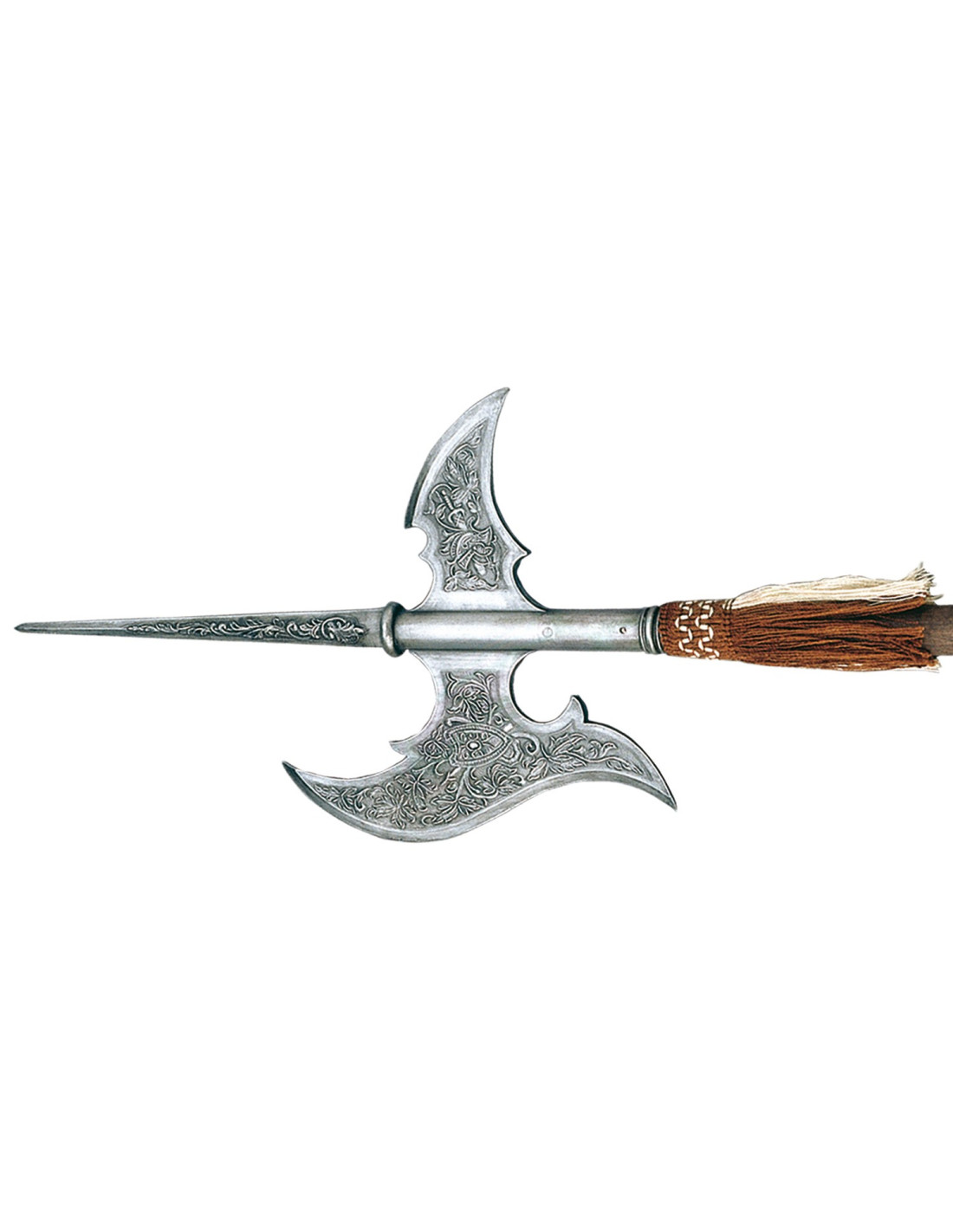 Jedes Detail dieser Hellebarde ist auf historische Funktionalität ausgelegt. Ihr Waffenhauptstück bietet eine vielseitige Konfiguration: eine Spitze für den Angriff für den Frontalangriff, eine querliegende Axt für kräftige Schläge und ein kleiner Gegenkopf zum Stechen oder Haken. Diese Kombination machte sie zu einer beeindruckenden Waffe auf dem Schlachtfeld.
