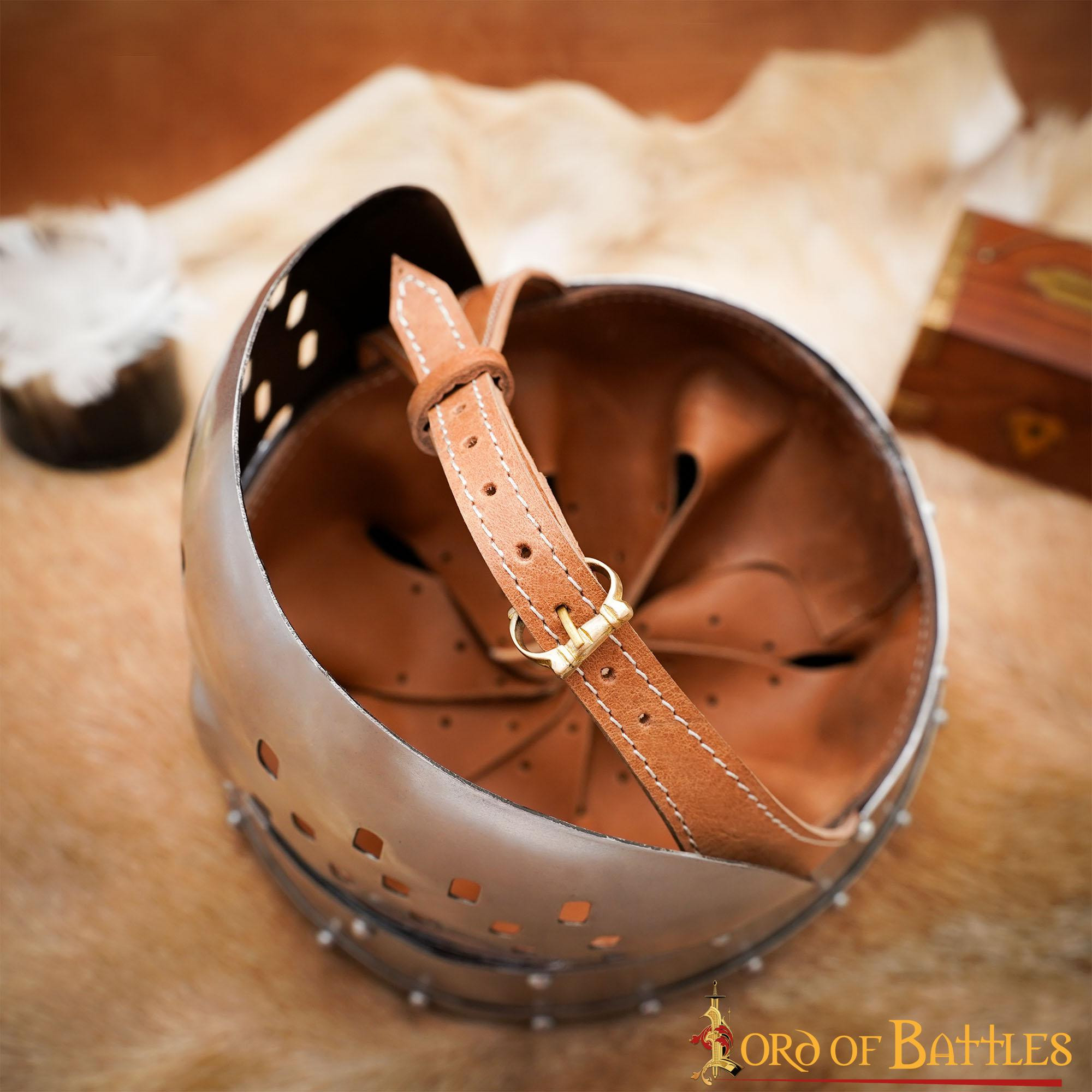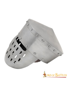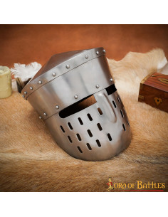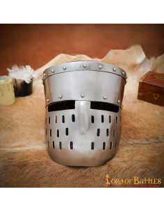 Das Schwert eines unbesiegbaren Ritters bleibt fest in Ihrer gepanzerten Faust, und Ihr Banner schwebt im Wind, während Ihr Knappe sich für den Kampf auf den robusten Kreuzritterhelm aus dem 13. Jahrhundert schnallt. Die perforierte Frontplatte erleichtert die Belüftung, während Sie gegen Ihren Feind kämpfen, und schützt Sie vor Pfeilen, die auf Sie und Ihre Mitritter niederprasseln und auf den Befehl zum Angriff warten!